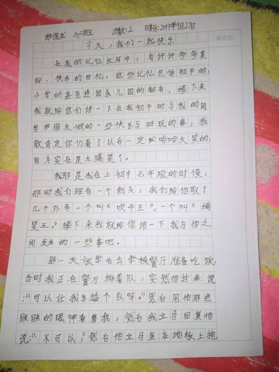 今天我们一起快乐 热243 类别:叙事 发表时间:2019-09-28 09:00 已有 244 次阅读 指导老师:王宇丹 所属学校:登封市大金店镇第一初级中学