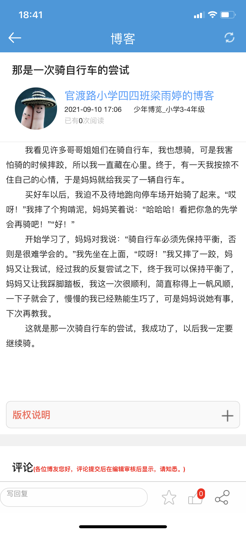 那是一次骑自行车的尝试 热250 类别:叙事 发表时间:2021-09-10 18:43 已有 251 次阅读 指导老师:孙瑞萍 所属学校:中牟县官渡路小学