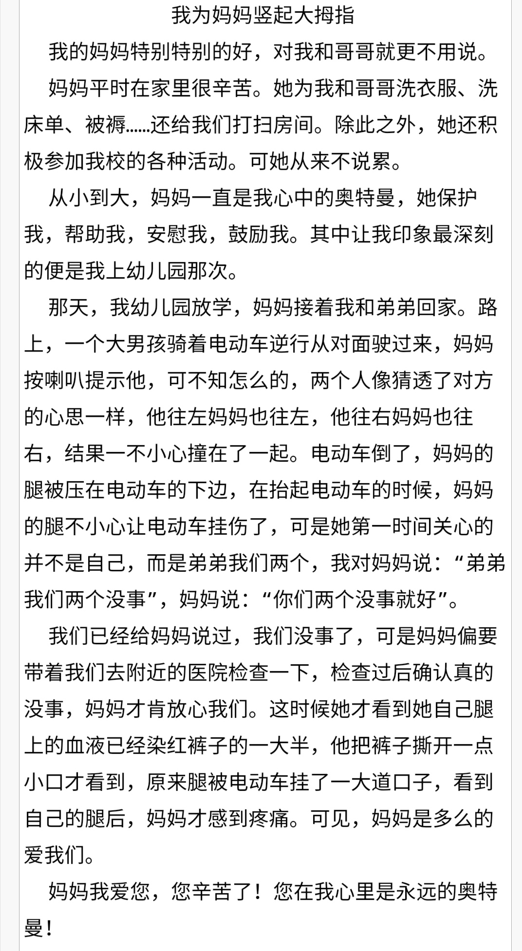 我为妈妈竖起大拇指 热555 类别:写人 发表时间:2019-10-08 21:40 已有 556 次阅读 指导老师:乔丽萍 所属学校:新郑市第二实验小学