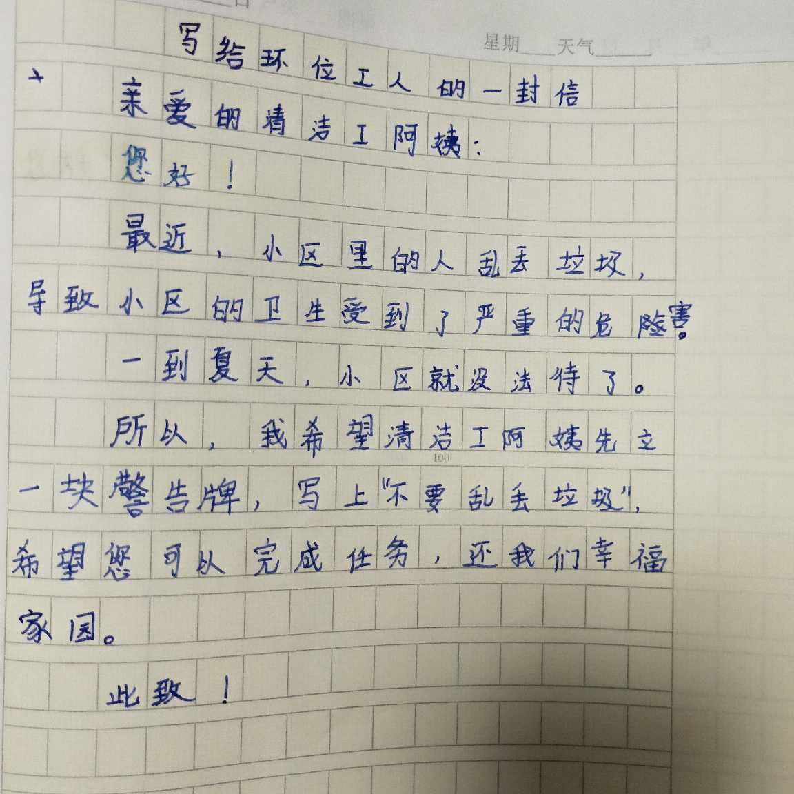 写给环卫工人的一封信 热597 类别:写人 发表时间:2020-06-11 20:42 已有 598 次阅读 指导老师:张珊老师 所属学校:新郑市第二实验小学