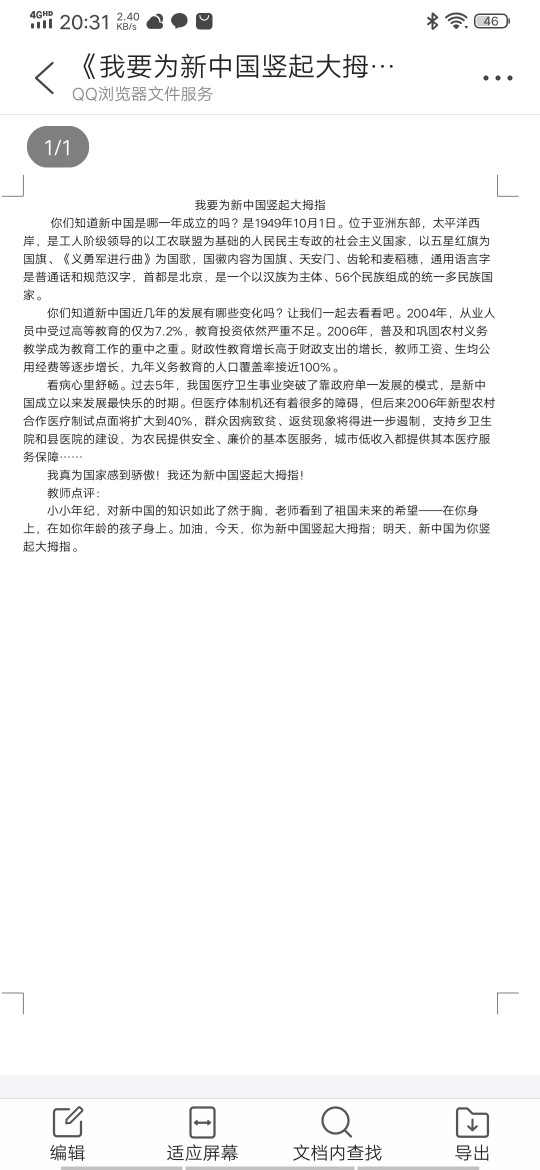 我为新中国竖起大拇指 热891 类别:写人 发表时间:2019-10-08 20:32 已有 892 次阅读 指导老师:郭月 所属学校:锦龙小学