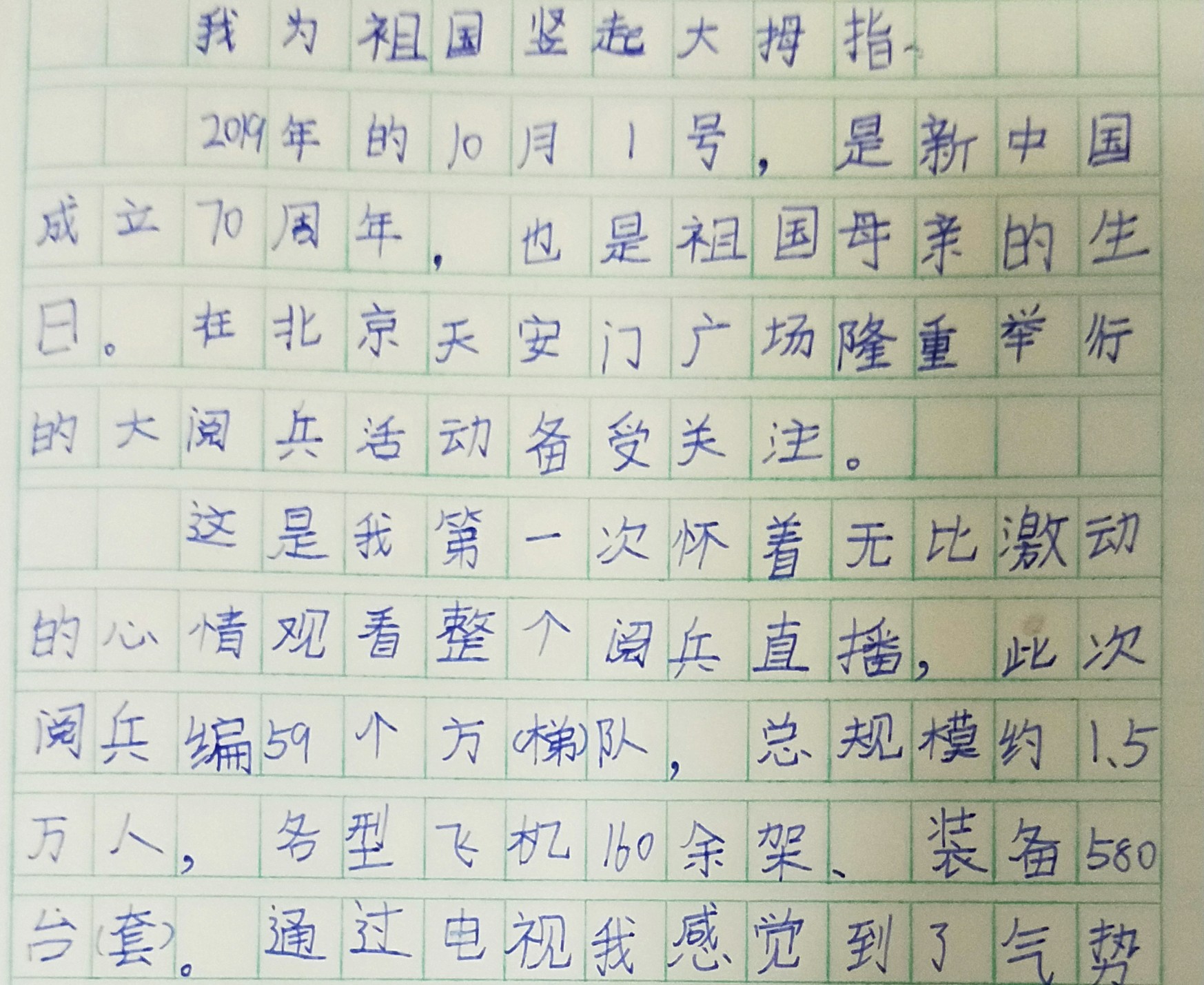 我为祖国竖起大拇指 热715 类别:抒情 发表时间:2019-10-09 07:09 已有 716 次阅读 指导老师:张艳荣 所属学校:新郑市第二实验小学