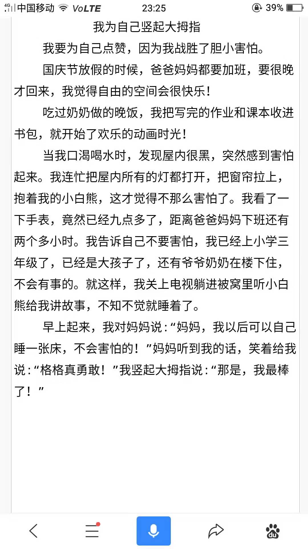 我为自己竖起大拇指 热449 类别:记叙 发表时间:2019-10-08 23:35 已有 450 次阅读 指导老师:冯志敏 所属学校:新郑市第二实验小学