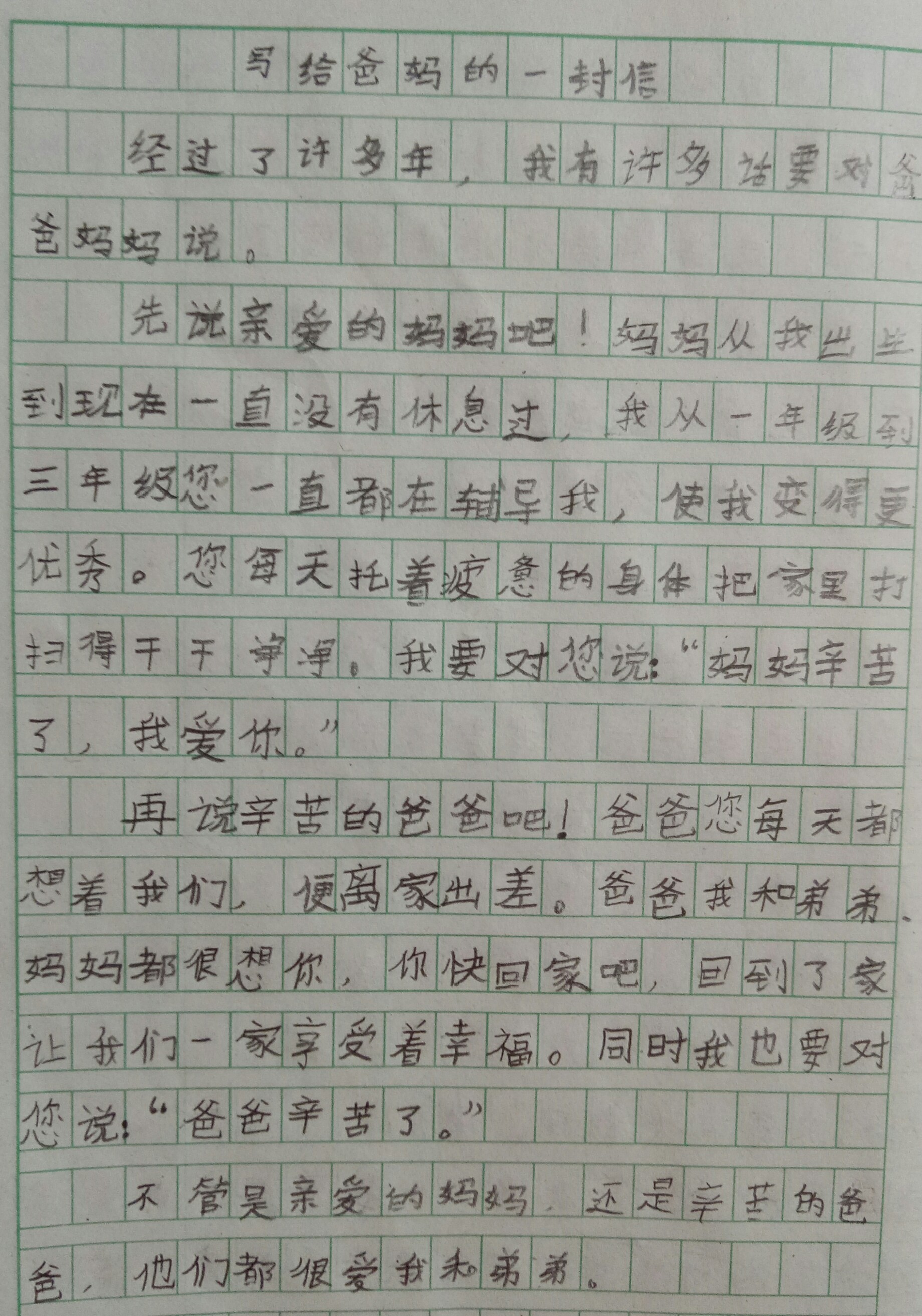 写给爸妈的一封信 热238 类别:抒情 发表时间:2020-06-17 22:38 已有 239 次阅读 指导老师:张艳荣 所属学校:新郑市第二实验小学