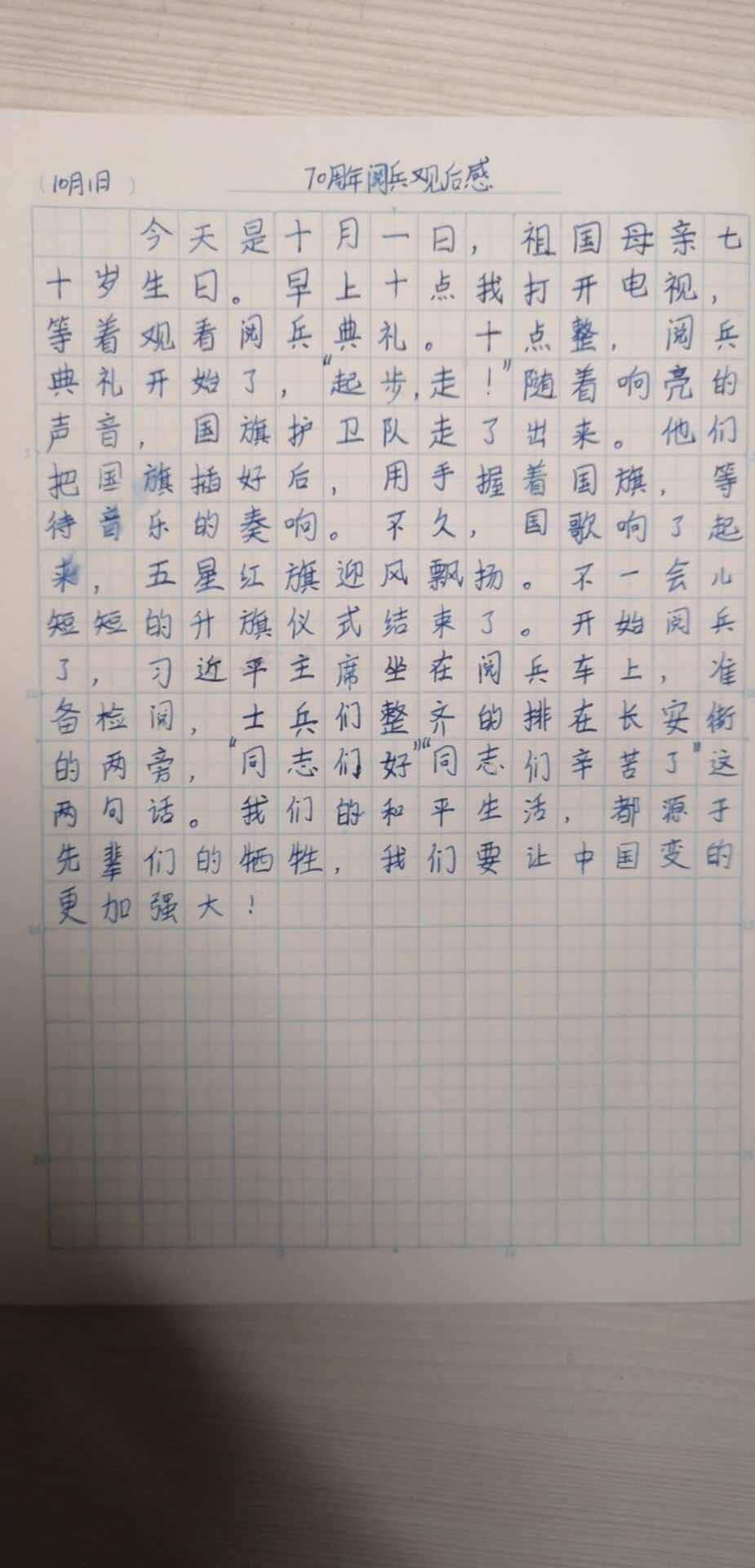 70周年阅兵观后感 热559 类别:记叙 发表时间:2019-10-08 23:38 已有 560 次阅读 指导老师:王巧云 所属学校:郑州市二七区陇西小学