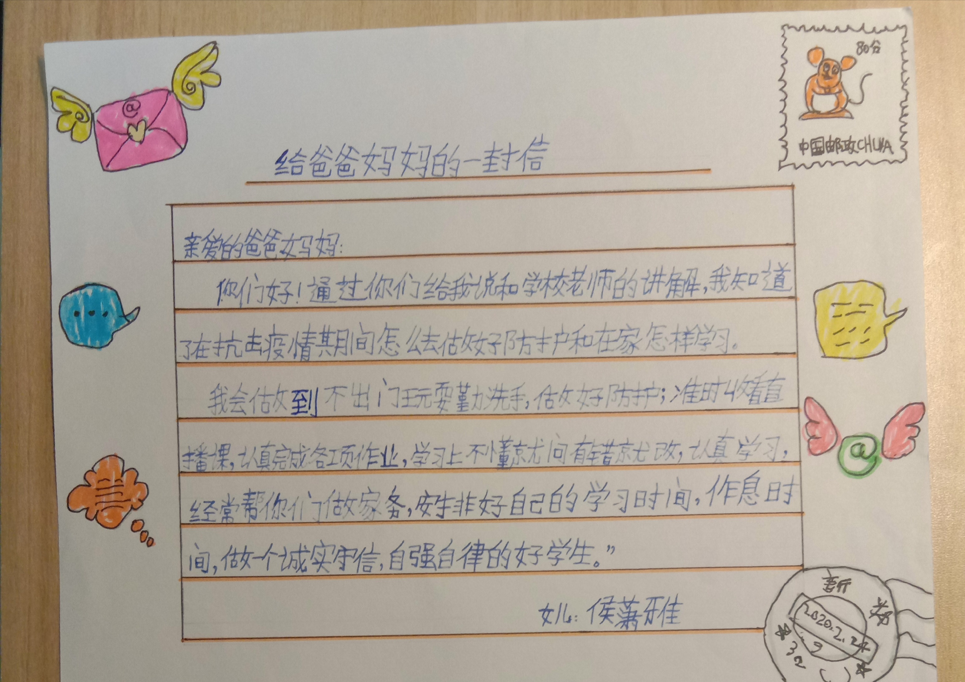 写给爸爸妈妈的一封信 热424 类别:记叙 发表时间:2020-06-17 21:18 已有 425 次阅读 指导老师:孙丽娜 所属学校:新郑市第二实验小学