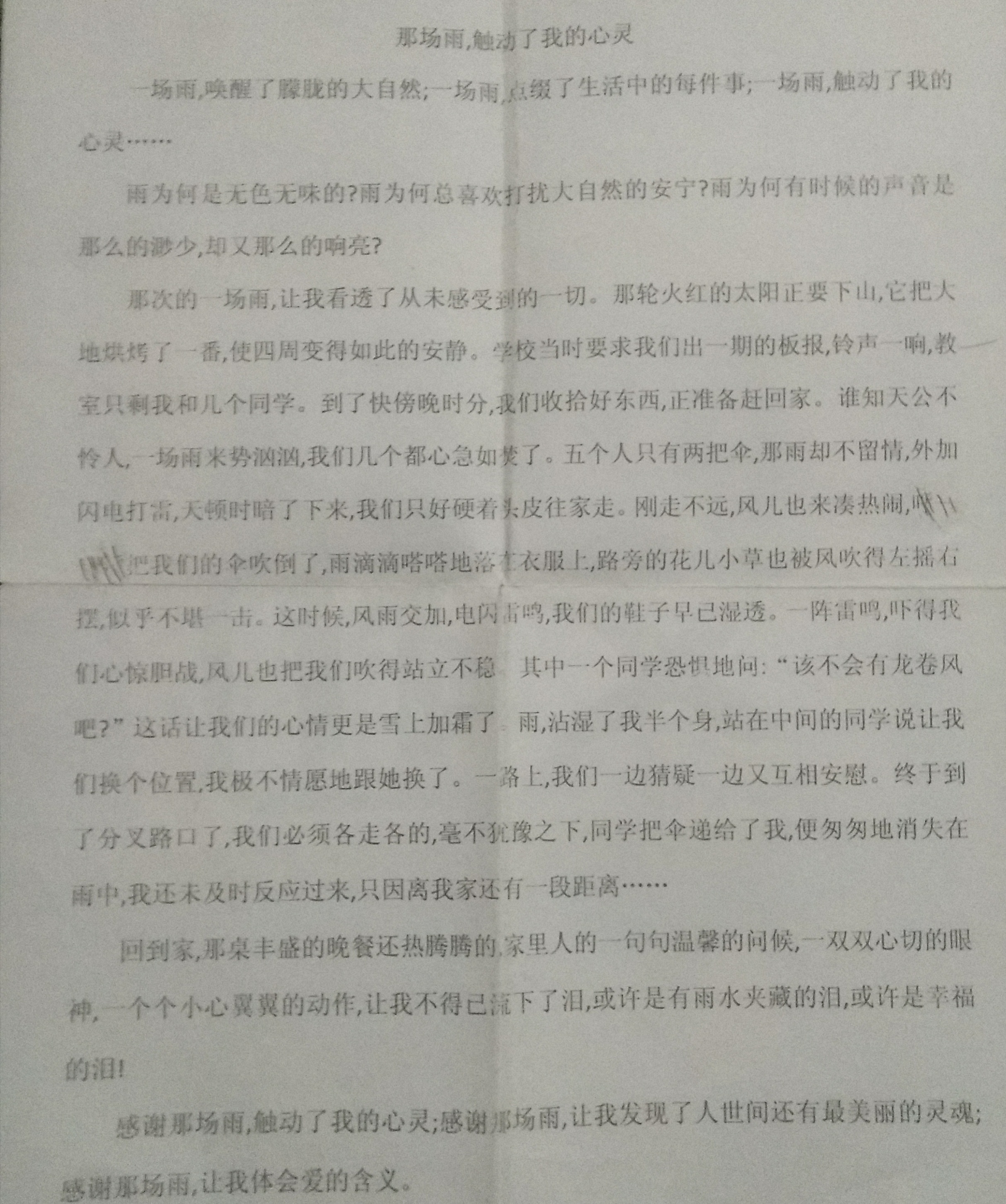 那场雨,触动了我的心灵 热573 类别:抒情 发表时间:2019-10-09 21:56 已有 574 次阅读 指导老师:张留勤 所属学校:新郑市第二实验小学