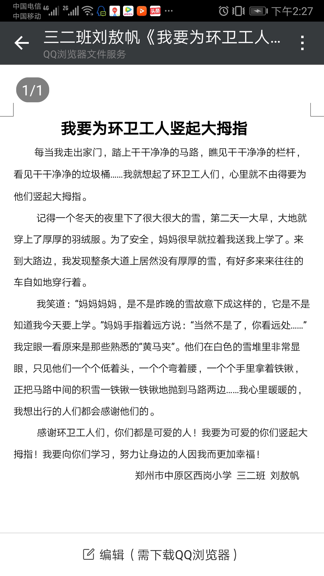 我要为环卫工人竖起大拇指 热944 类别:写人 发表时间:2019-10-12 14:35 已有 945 次阅读 指导老师:海瑞芳 所属学校:郑州市中原区西岗小学