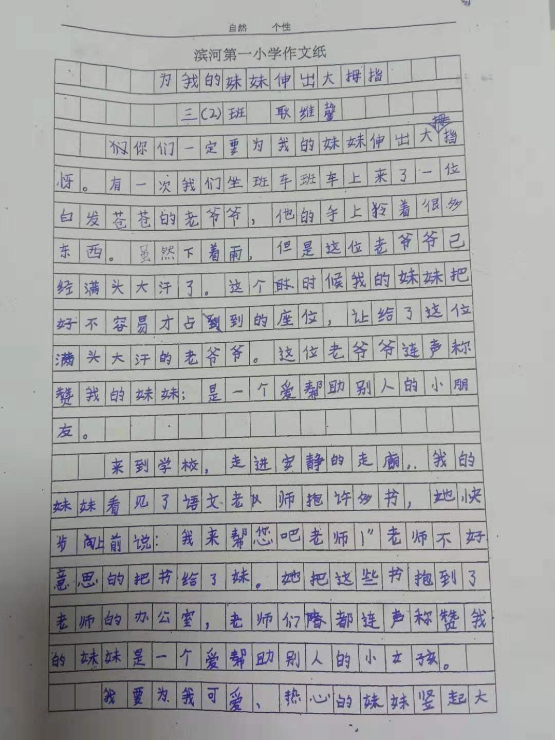 为我的妹妹伸出大拇指 热457 类别:叙事 发表时间:2019-10-12 20:12 已有 458 次阅读 指导老师:赵宁 所属学校:滨河第一小学