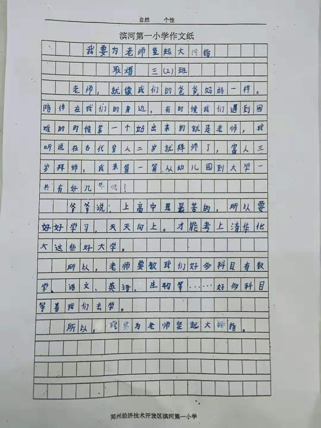 我要为老师竖起大拇指 热592 类别:叙事 发表时间:2019-10-12 20:24 已有 593 次阅读 指导老师:赵宁 所属学校:滨河第一小学