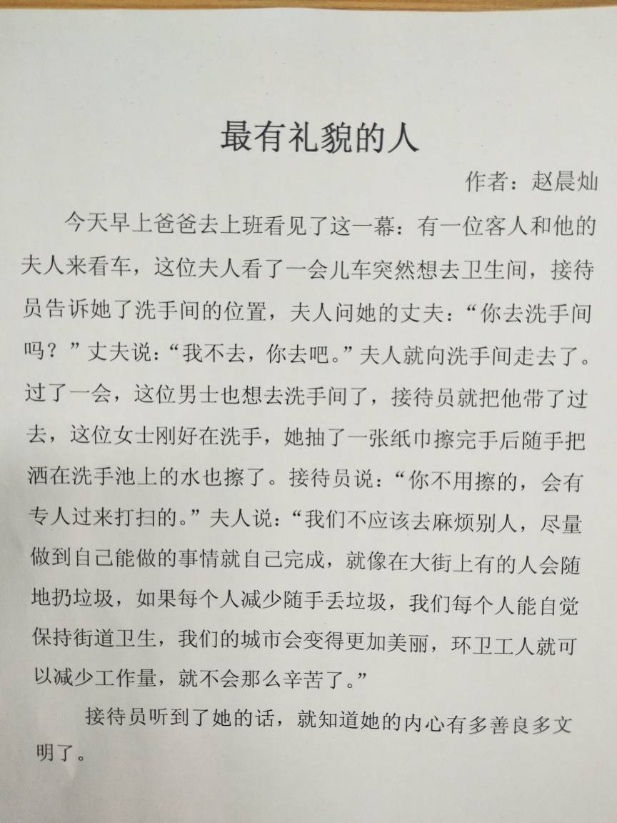 最有礼貌的人 热301 类别:记叙 发表时间:2019-10-13 16:29 已有 302 次阅读 指导老师:张建玲 所属学校:滨河第一小学