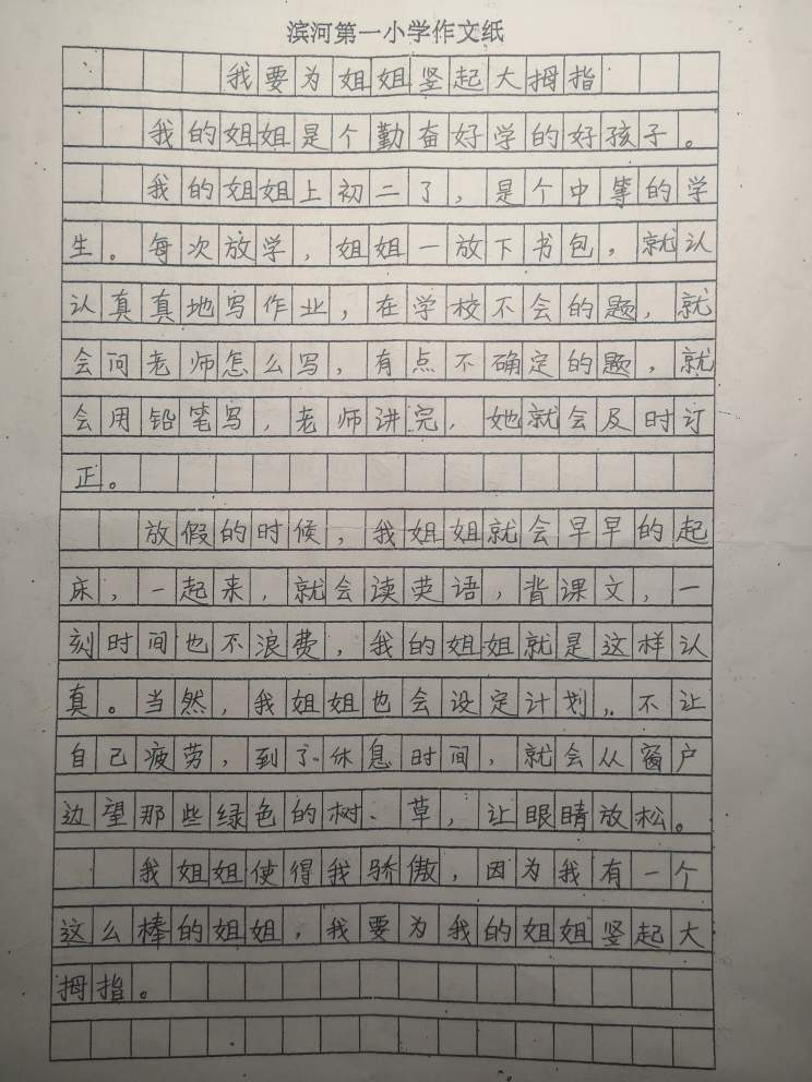 我要为姐姐竖起大拇指 热170 类别:叙事 发表时间:2019-10-14 12:49 已有 171 次阅读 指导老师:徐盼盼 所属学校:滨河第一小学