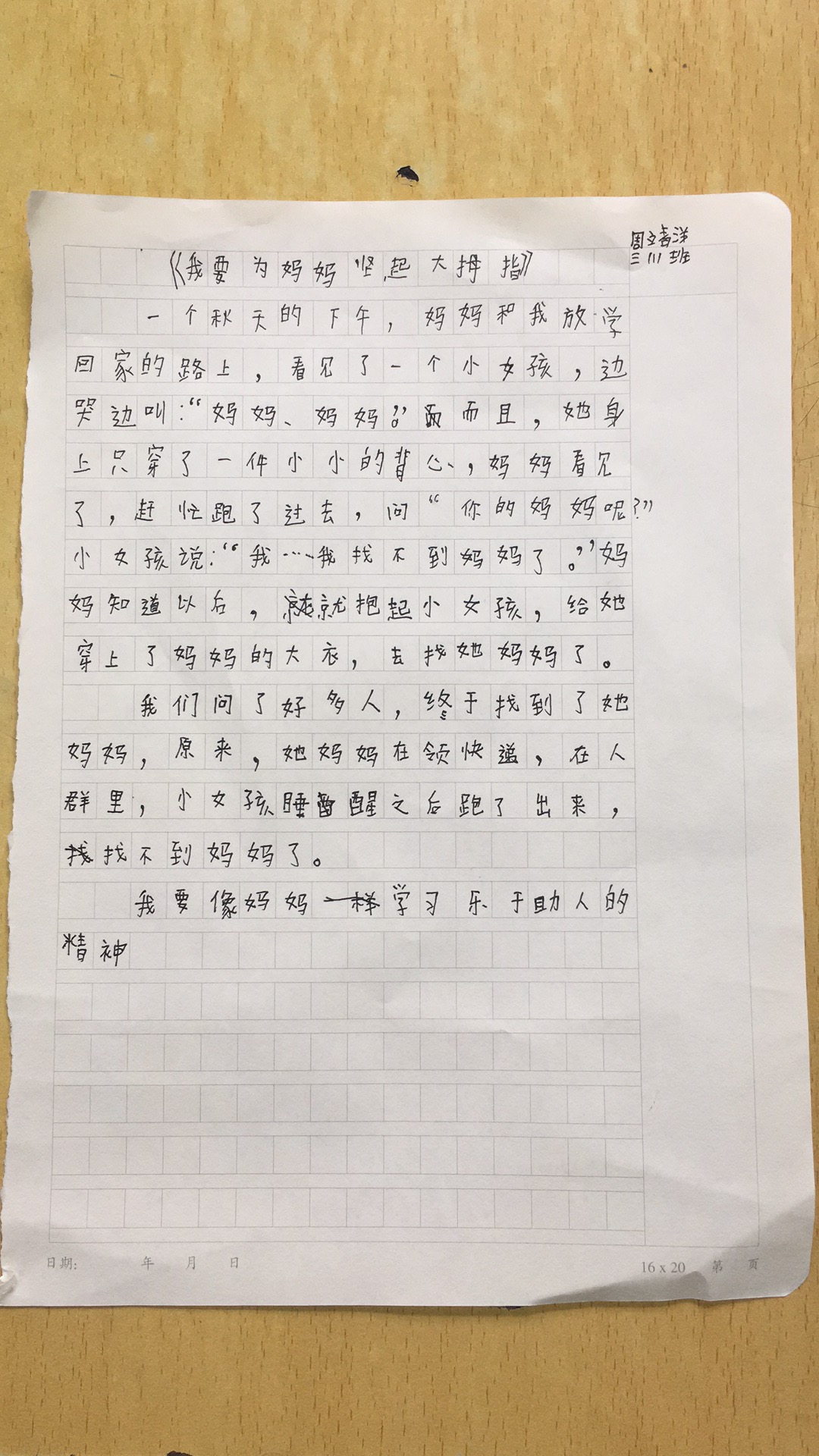 我要为妈妈竖起大拇指 热262 类别:叙事 发表时间:2019-10-15 15:25 已有 263 次阅读 指导老师:白少慧 所属学校:郑州市惠济区开元路小学