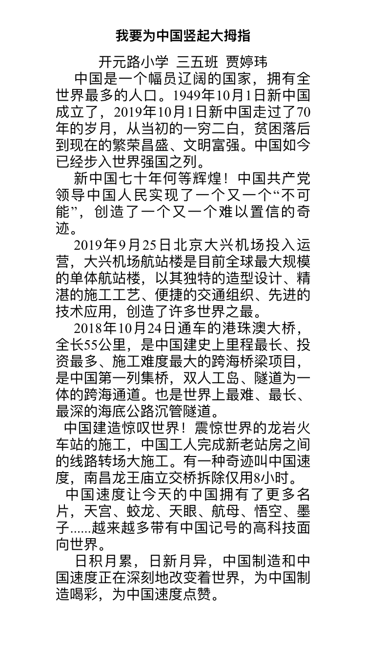 我要为中国竖起大拇指 热423 类别:抒情 发表时间:2019-10-15 15:49 已有 424 次阅读 指导老师:曲剑 所属学校:郑州市惠济区开元路小学