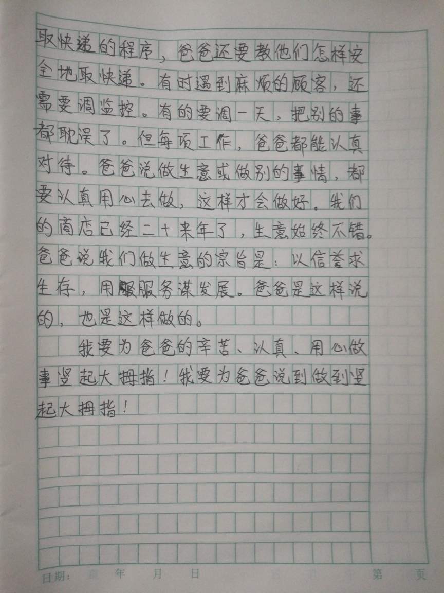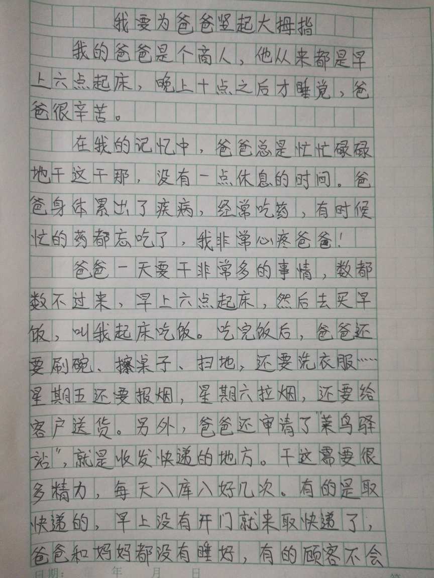 我要为爸爸竖起大拇指 热1504 类别:写人 发表时间:2019-10-15 20:49 已有 1504 次阅读 指导老师:乔胜男 所属学校:中牟县解放路小学