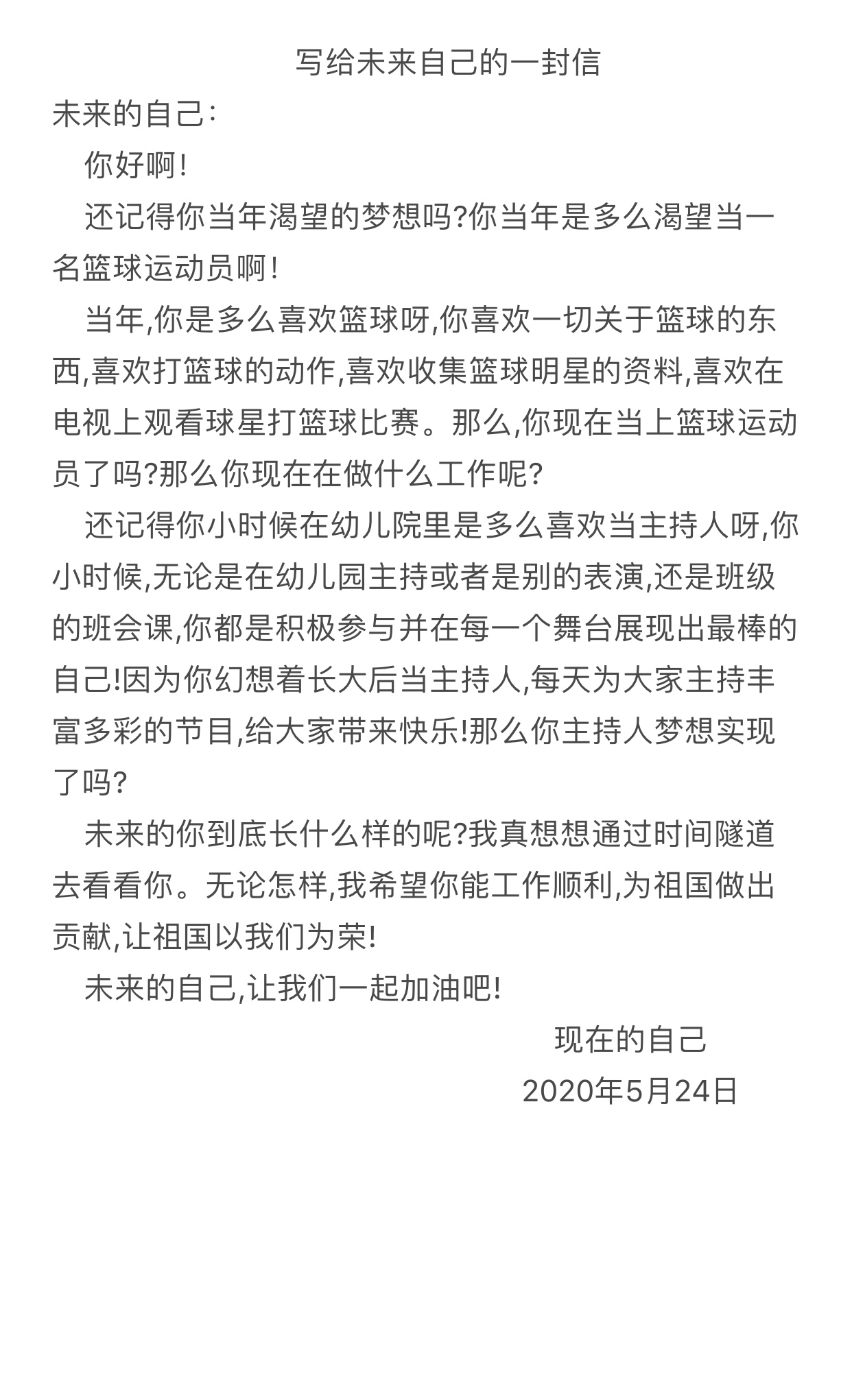 写给未来自己的一封信 热298 类别:应用 发表时间:2020-05-25 16:21 已有 299 次阅读 指导老师:蔡亚莎 所属学校:郑州市中原区互助路小学