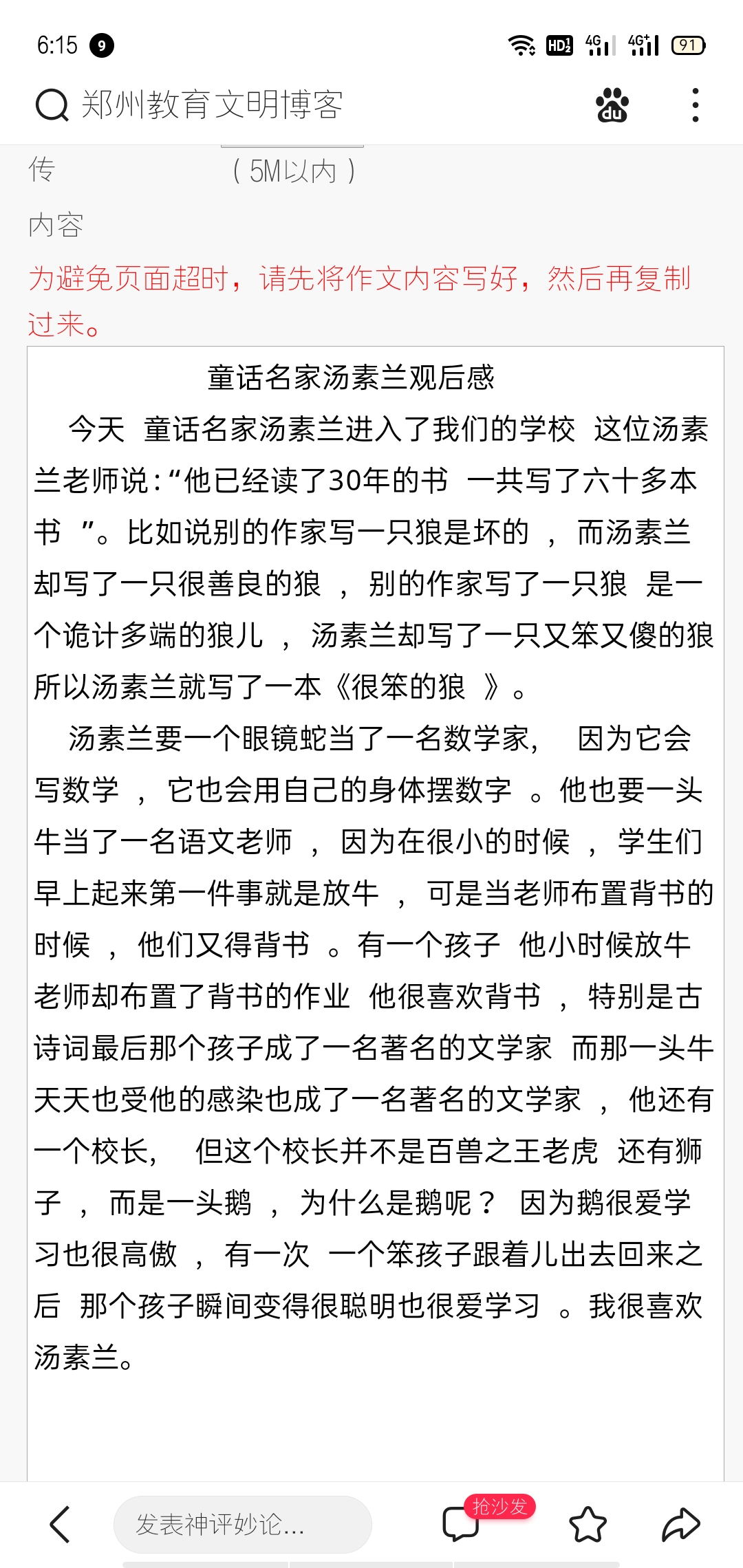 童话名家汤素兰观后感 热626 类别:写人 发表时间:2021-05-08 18:17 已有 627 次阅读 指导老师:刘婷婷 所属学校:登封市书院河路小学