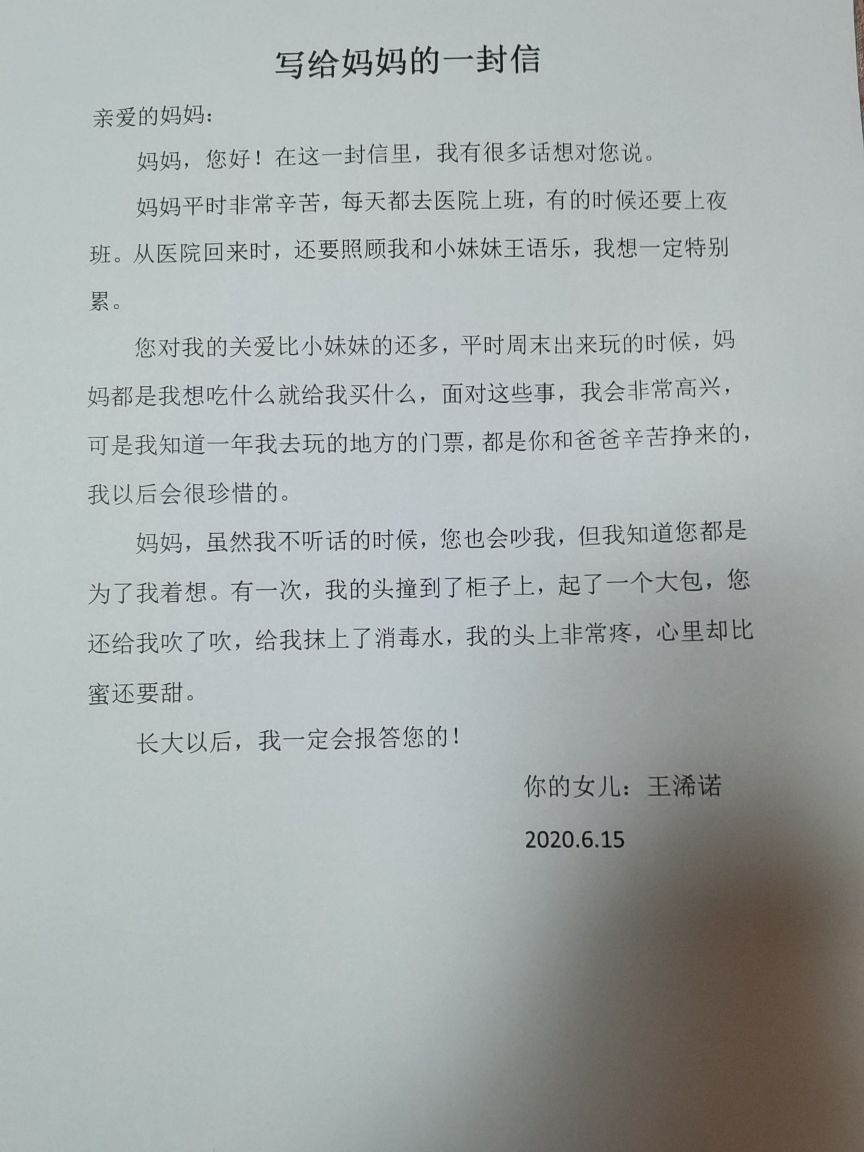 写给妈妈的一封信 热434 类别:叙事 发表时间:2020-06-15 00:11 已有 435 次阅读 指导老师:王丽红 所属学校:金水区纬五路第一小学