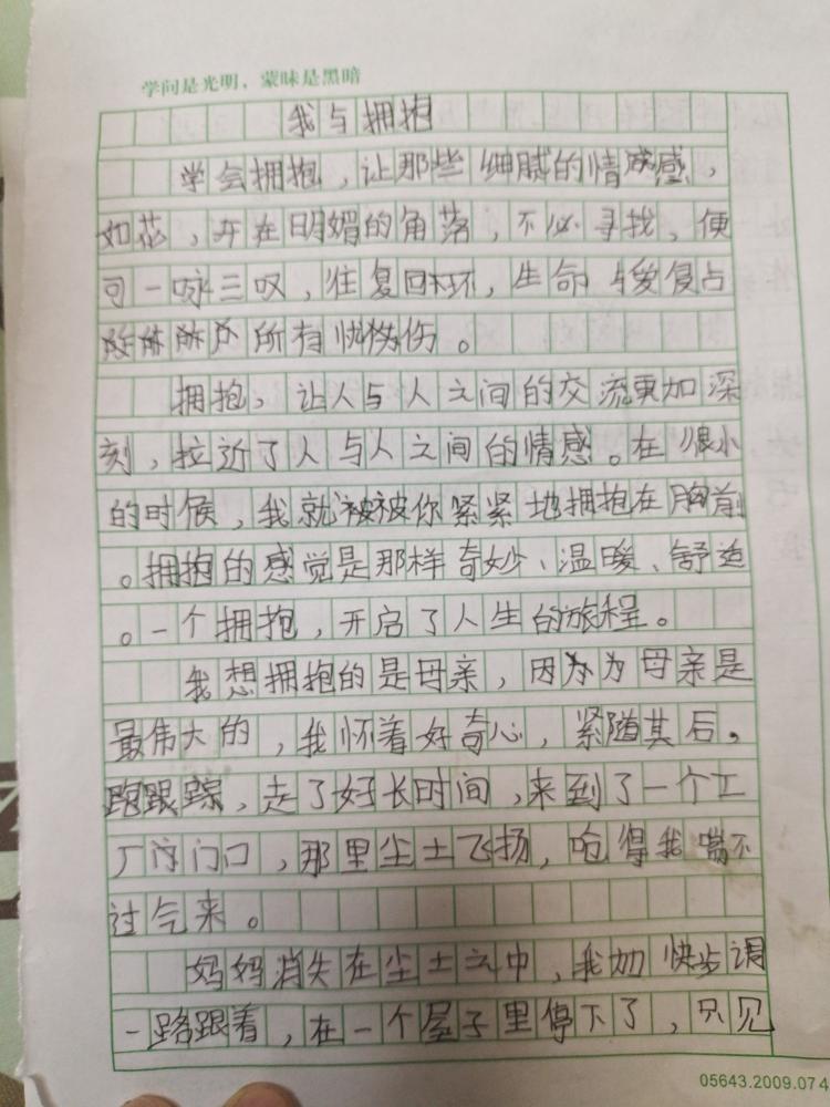 我与拥抱 热655 类别:写人 发表时间:2021-09-13 20:20 已有 656 次阅读 指导老师:陈婕妤 所属学校:中牟县官渡路小学