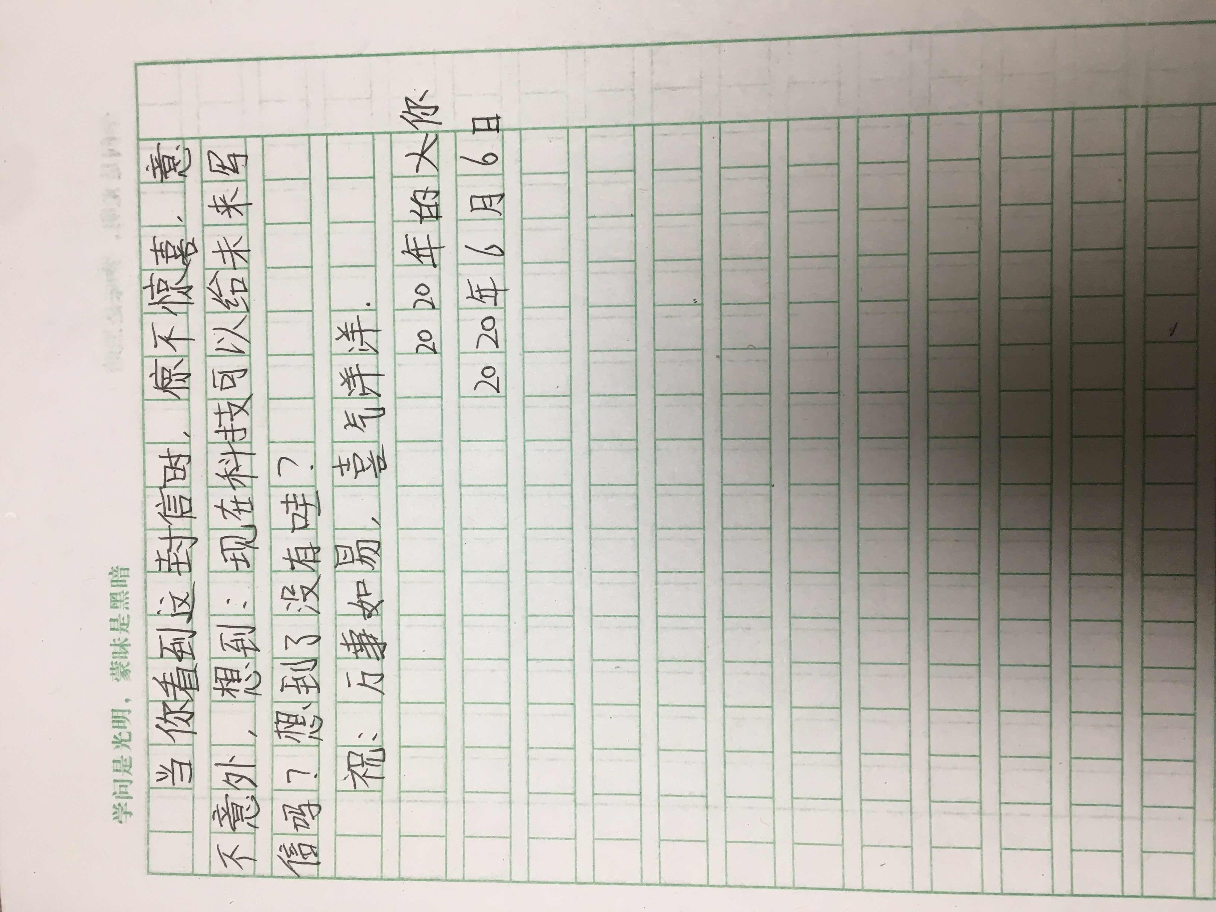 写给未来自己的一封信 热501 类别:记叙 发表时间:2020-06-06 17:17 已有 502 次阅读 指导老师:李瑞芳 所属学校:中牟县文明路小学