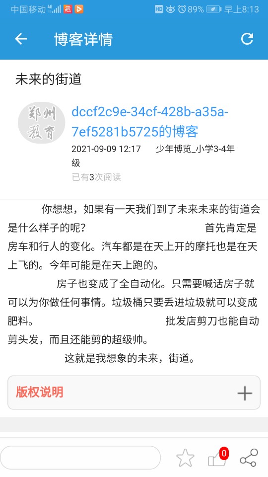 未来的街道 热706 类别:原创 发表时间:2021-09-13 20:49 已有 707 次阅读 指导老师:衡慧婷 所属学校:中牟县文明路小学