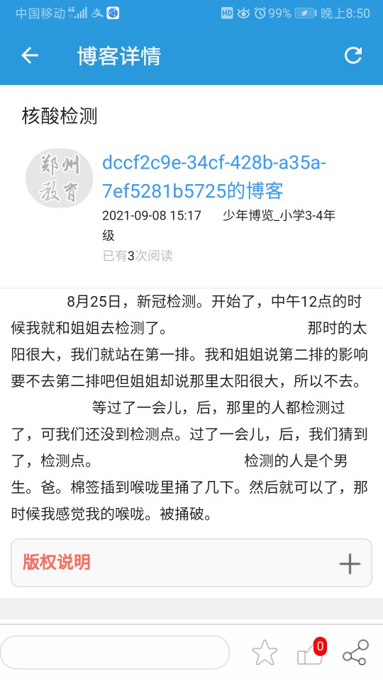 核酸检测 热767 类别:原创 发表时间:2021-09-13 20:53 已有 768 次阅读 指导老师:衡慧婷 所属学校:中牟县文明路小学