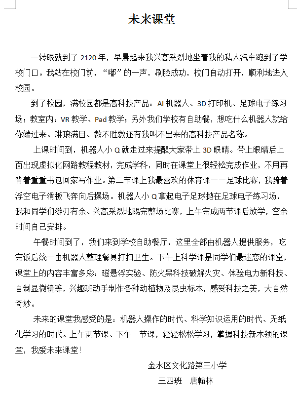 未来课堂 热279 类别:记叙 发表时间:2020-06-08 00:11 已有 279 次阅读 指导老师:师学瑶 所属学校:金水区文化路第三小学