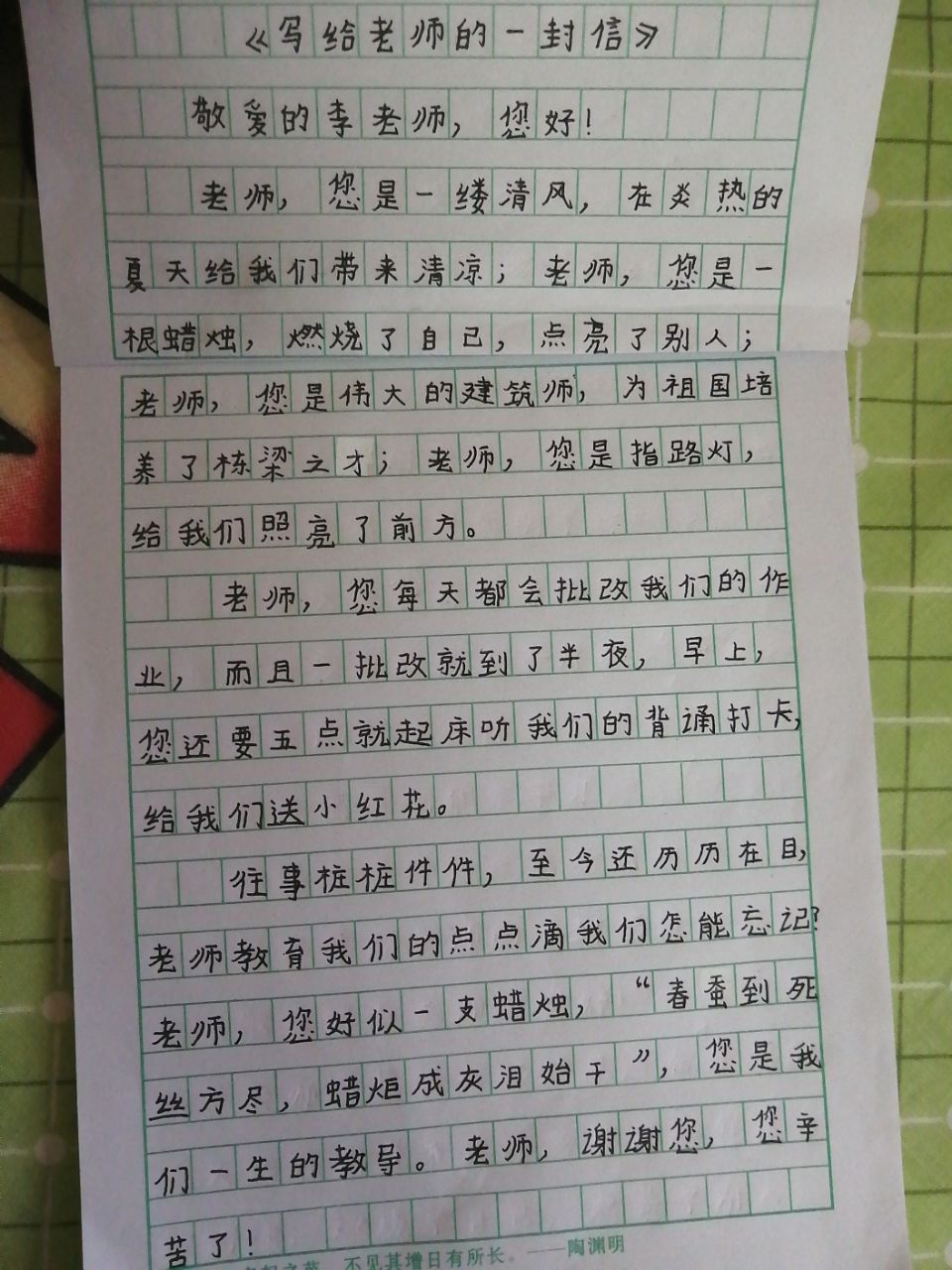 《写给老师的一封信》 热301 类别:写人 发表时间:2020-06-11 13:21 已有 302 次阅读 指导老师:李爱兰 所属学校:新郑市观音寺镇英李小学