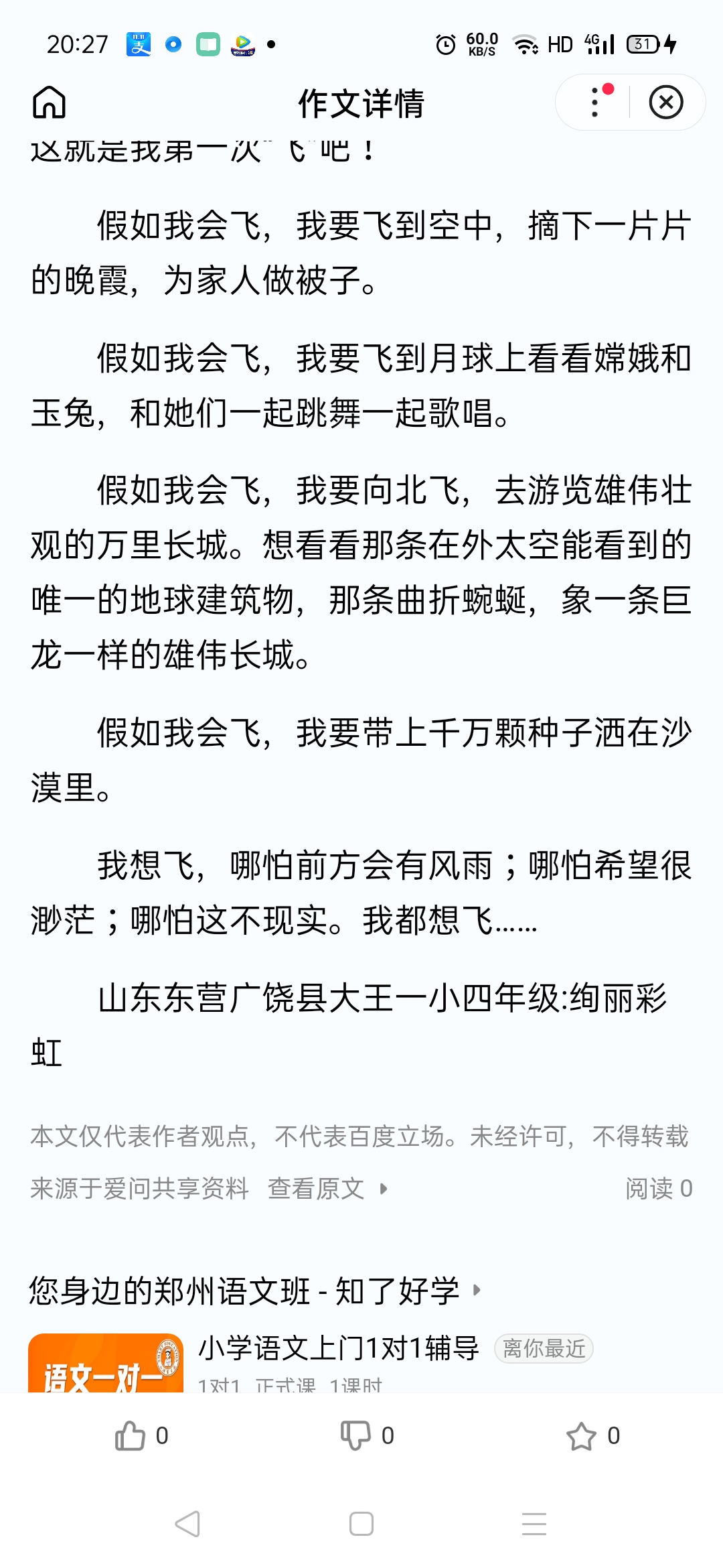 我想飞 热886 类别:叙事 发表时间:2020-10-27 20:57 已有 887 次阅读 指导老师:常艺霞 所属学校:新郑市外国语小学