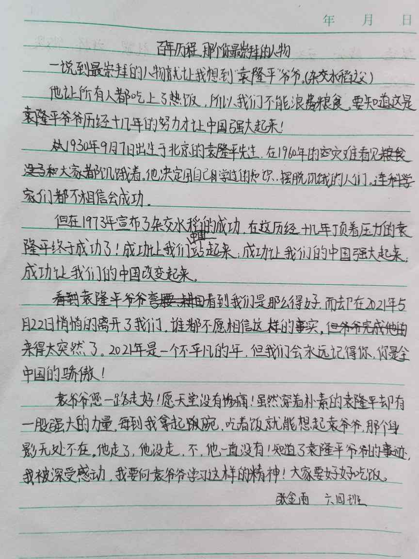 百年历史,那个你最崇拜的人物 热419 类别:写人 发表时间:2021-09-14 11:00 已有 420 次阅读 指导老师:康艳娜 所属学校:中牟县紫薇路小学