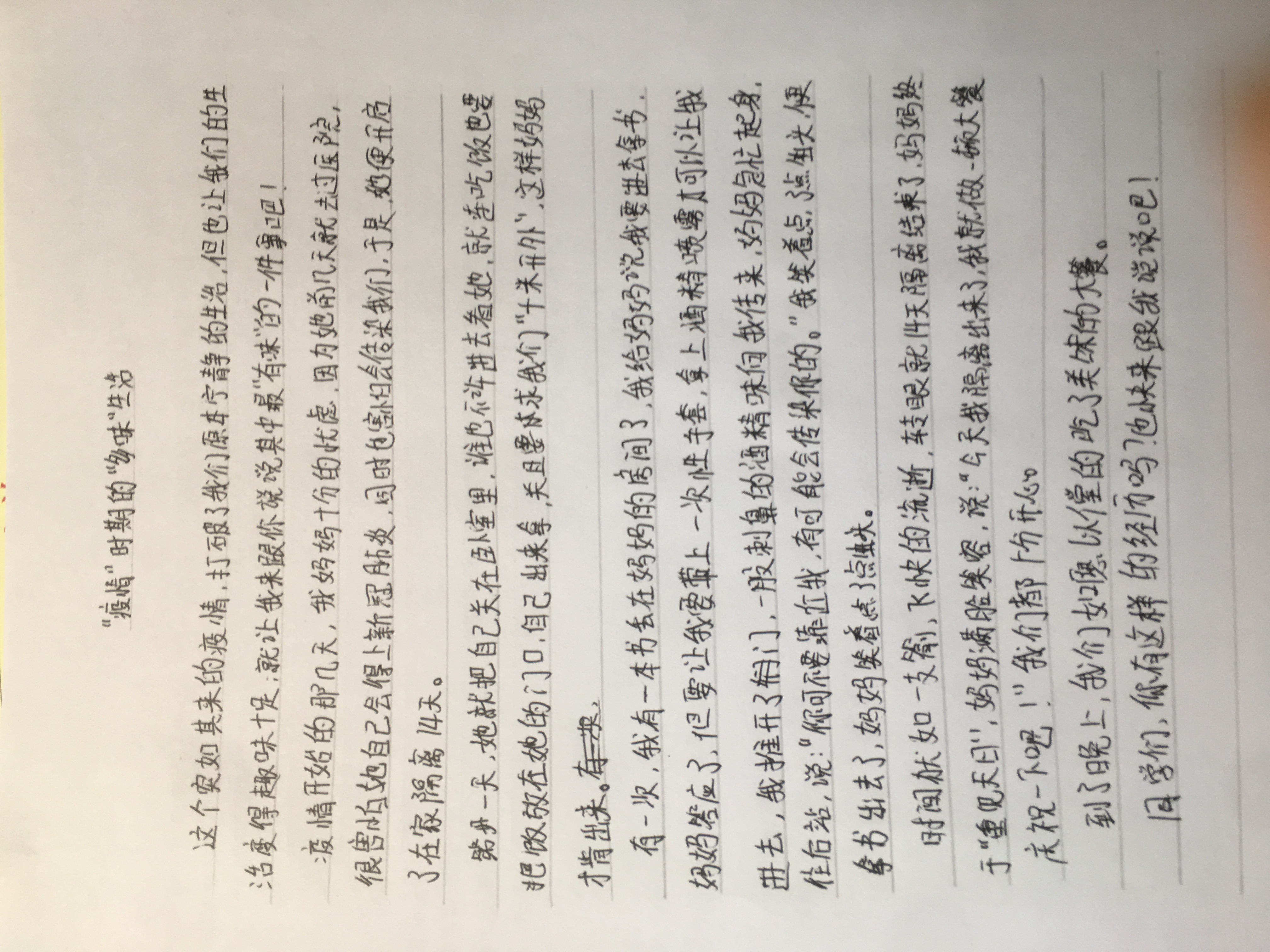 “疫情”时期的“多味”生活 热518 类别:记叙 发表时间:2020-06-21 13:03 已有 519 次阅读 指导老师:赵 所属学校:新郑市崇文中学