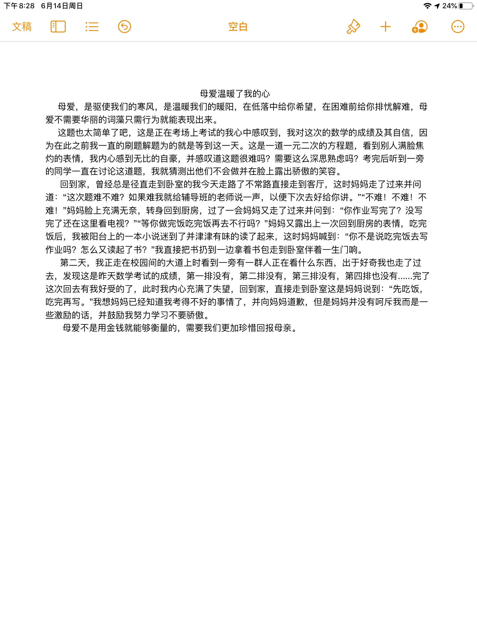 母爱温暖了我的心 热285 类别:记叙 发表时间:2021-08-19 22:19 已有 286 次阅读 指导老师:张子阳 所属学校:巩义市第一高级中学