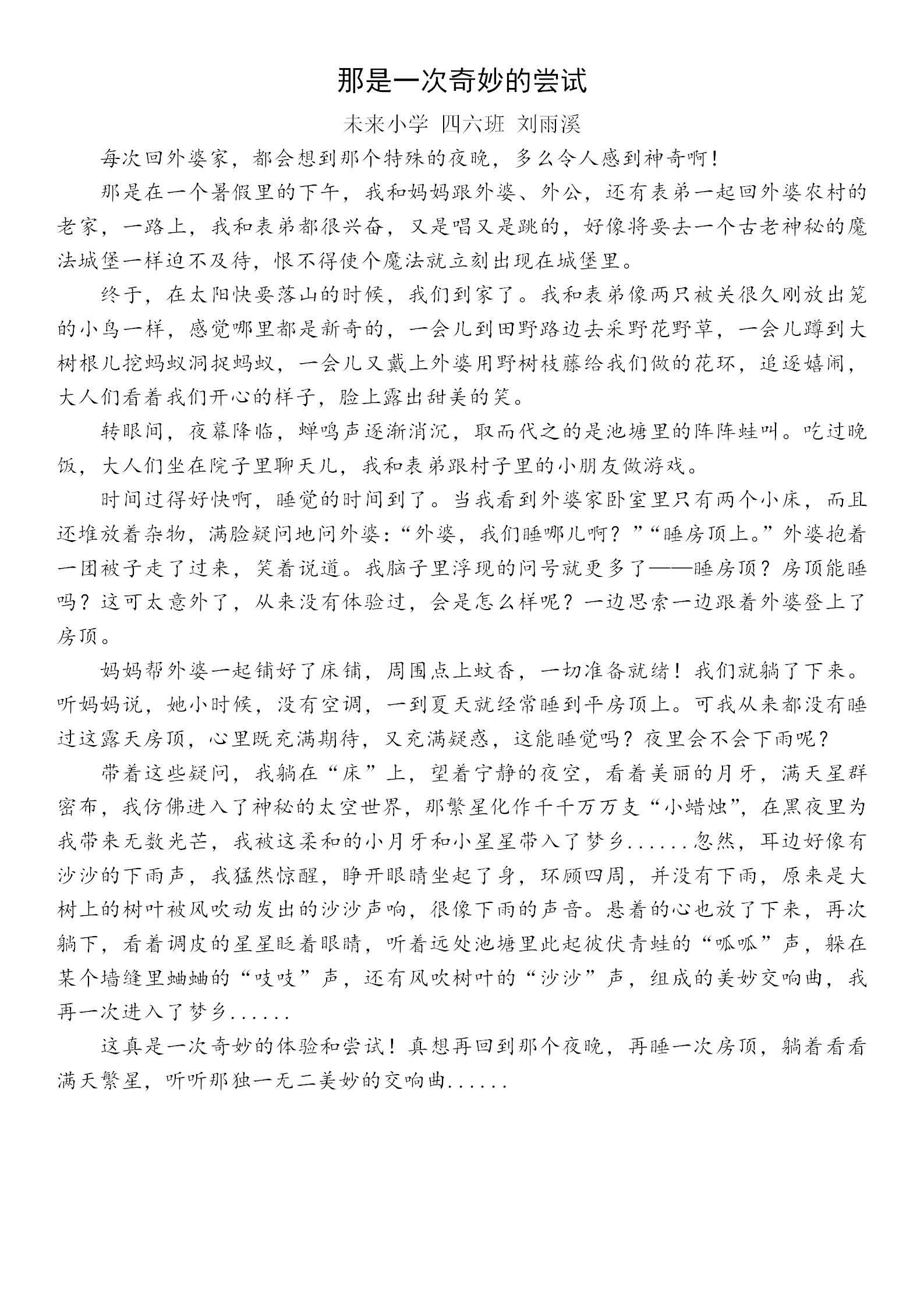 那是一次奇妙的尝试 热719 类别:记叙 发表时间:2021-07-28 17:20 已有 720 次阅读 指导老师:鲍红 所属学校:金水区未来小学