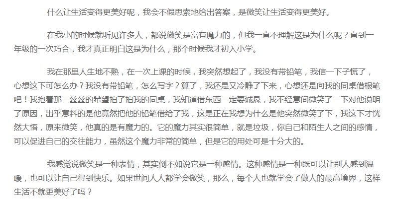 微笑让生活更美好 热1126 类别:叙事 发表时间:2020-10-06 08:40 已有 1127 次阅读 指导老师:常君君 所属学校:金水区四月天小学