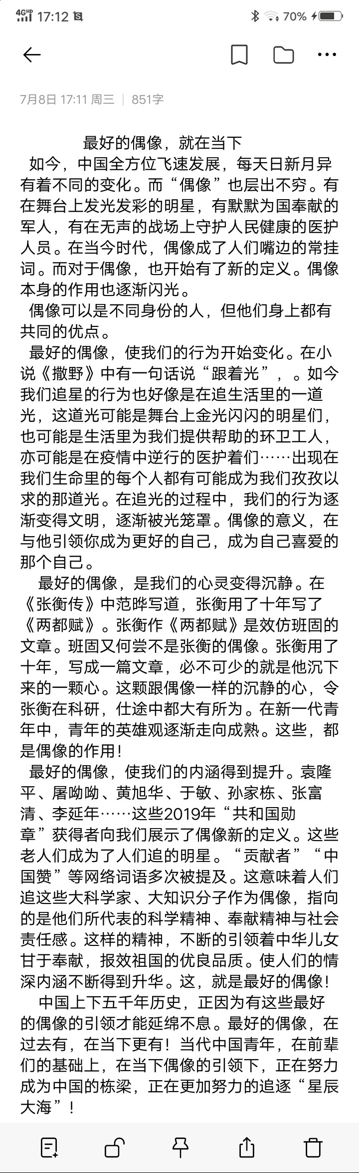 最好的偶像,就在当下 热513 类别:议论 发表时间:2020-07-08 17:21 已有 514 次阅读 指导老师:闫春霞 所属学校:巩义市第二高级中学