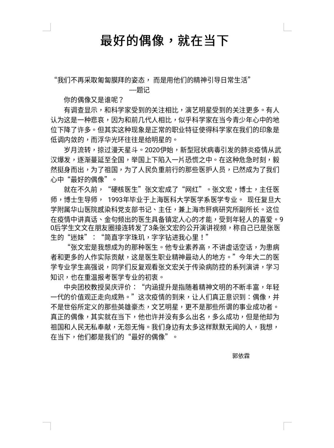 最好的偶像,就在当下 热408 类别:写人 发表时间:2020-07-09 13:48 已有 409 次阅读 指导老师:吴爱芹 所属学校:郑州市第五高级中学
