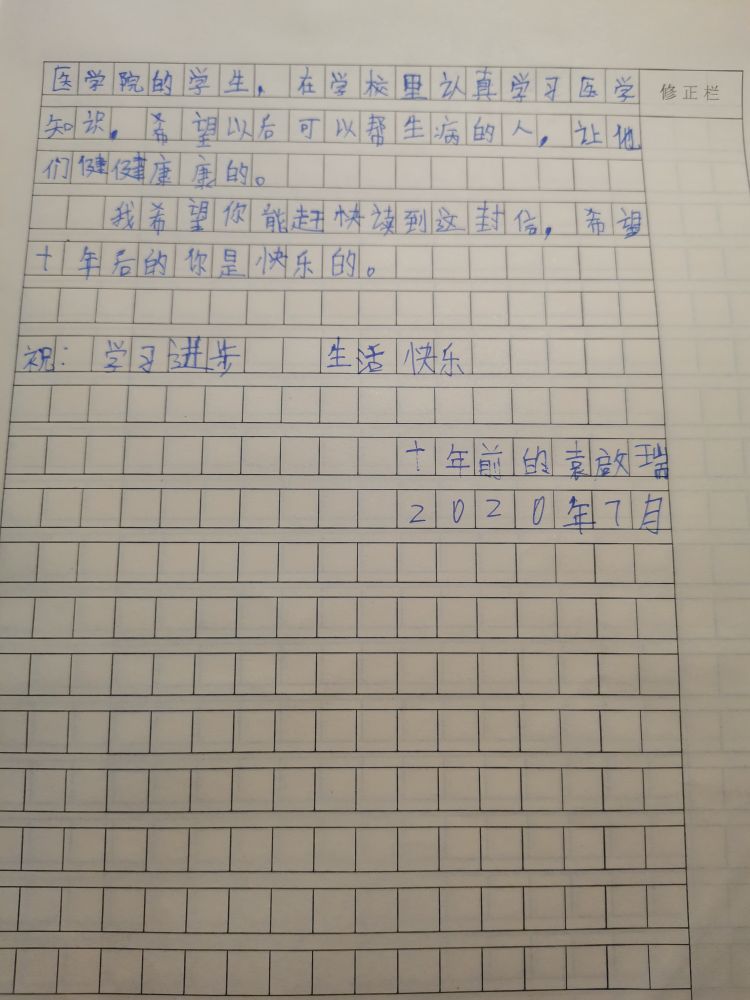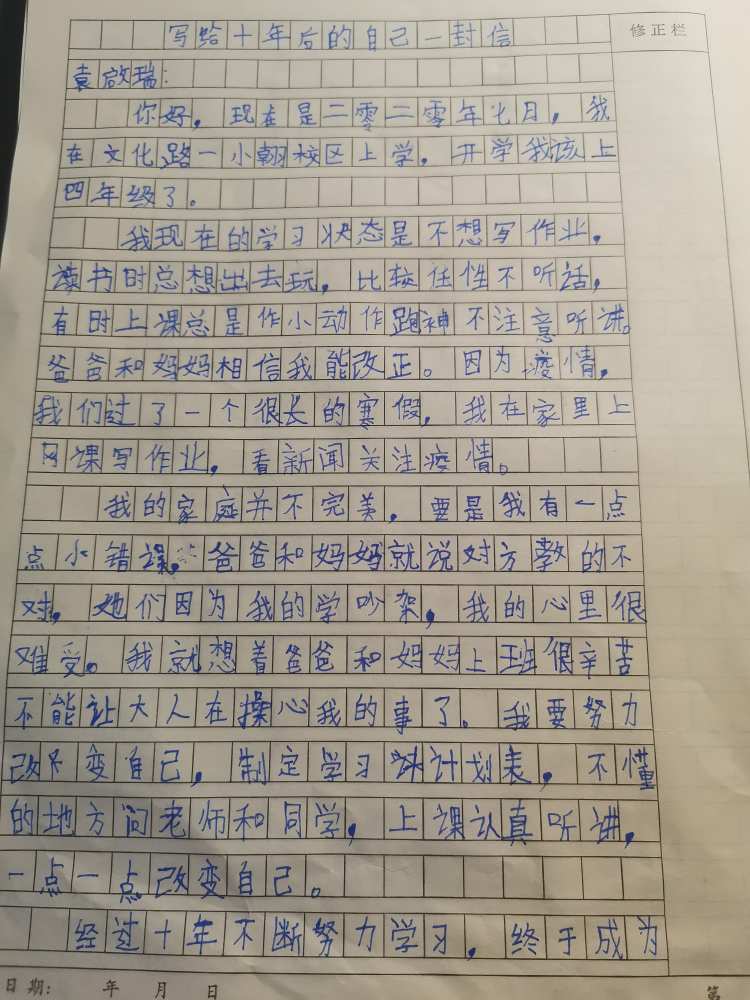 写给十年后自己的一封信 热747 类别:其他 发表时间:2020-07-15 15:32 已有 742 次阅读 指导老师:徐卉卉 所属学校:金水区文化路第一小学