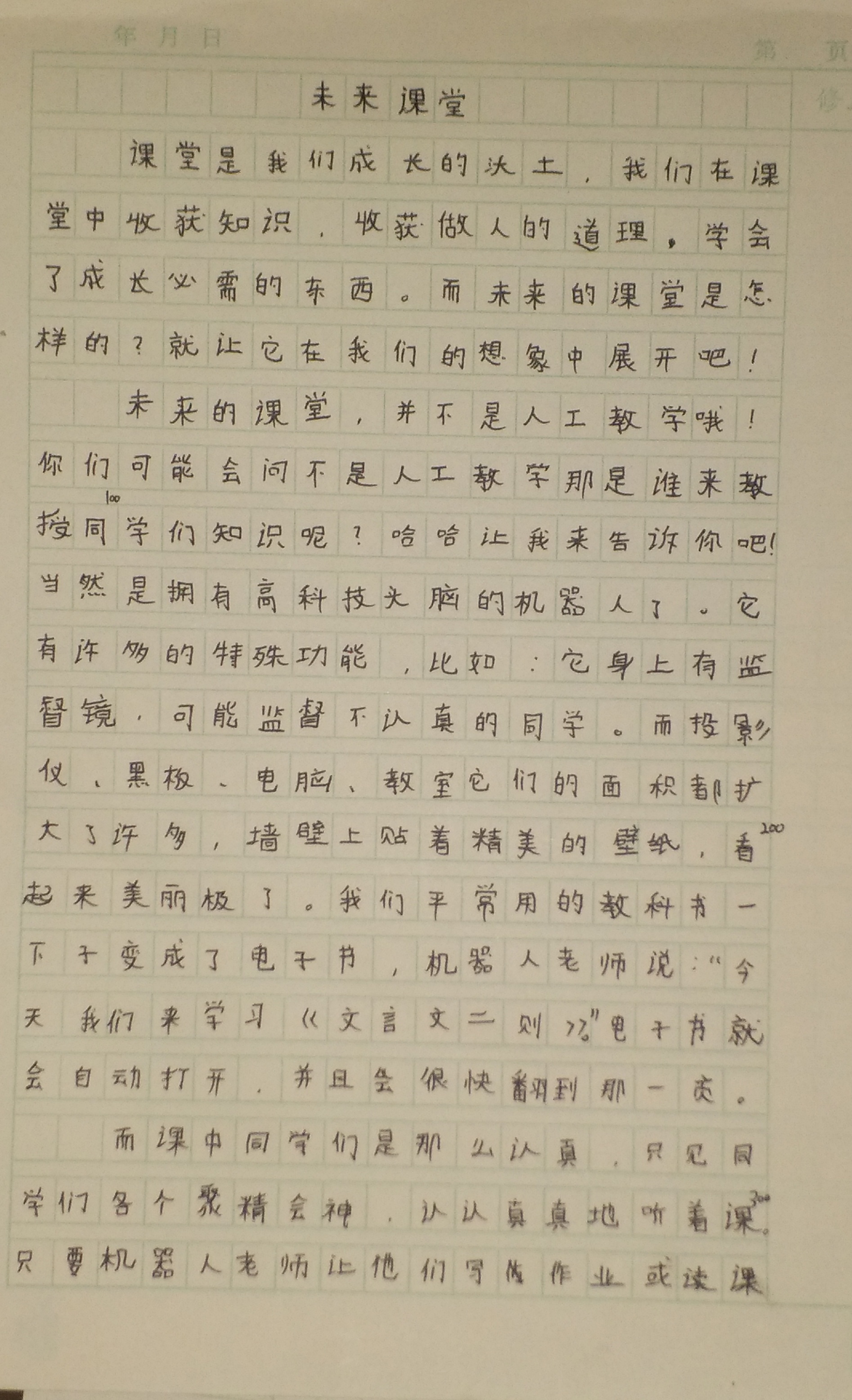 (2) 未来的课堂,并不是人工教学哦!你们可能会问不是人工教学那是谁来教授同学们知识呢?哈哈,让我来告诉你吧!当然是拥有高科技的机器人了。他有许多特殊功能,比如:他身上有监督镜,可能监督不认真的同学。而投影仪、黑板、电脑、教室他们的面积都扩大了许多,墙壁上贴着精美的壁画,看起来美丽极了。我们平常用的教科书一下子变成了电子书,机器人老师说:“今天我们来学习《文言文二则》。”电子书就会自动打开,并且会很快翻到那一页。 眉批:此处有的句子需要再推敲。