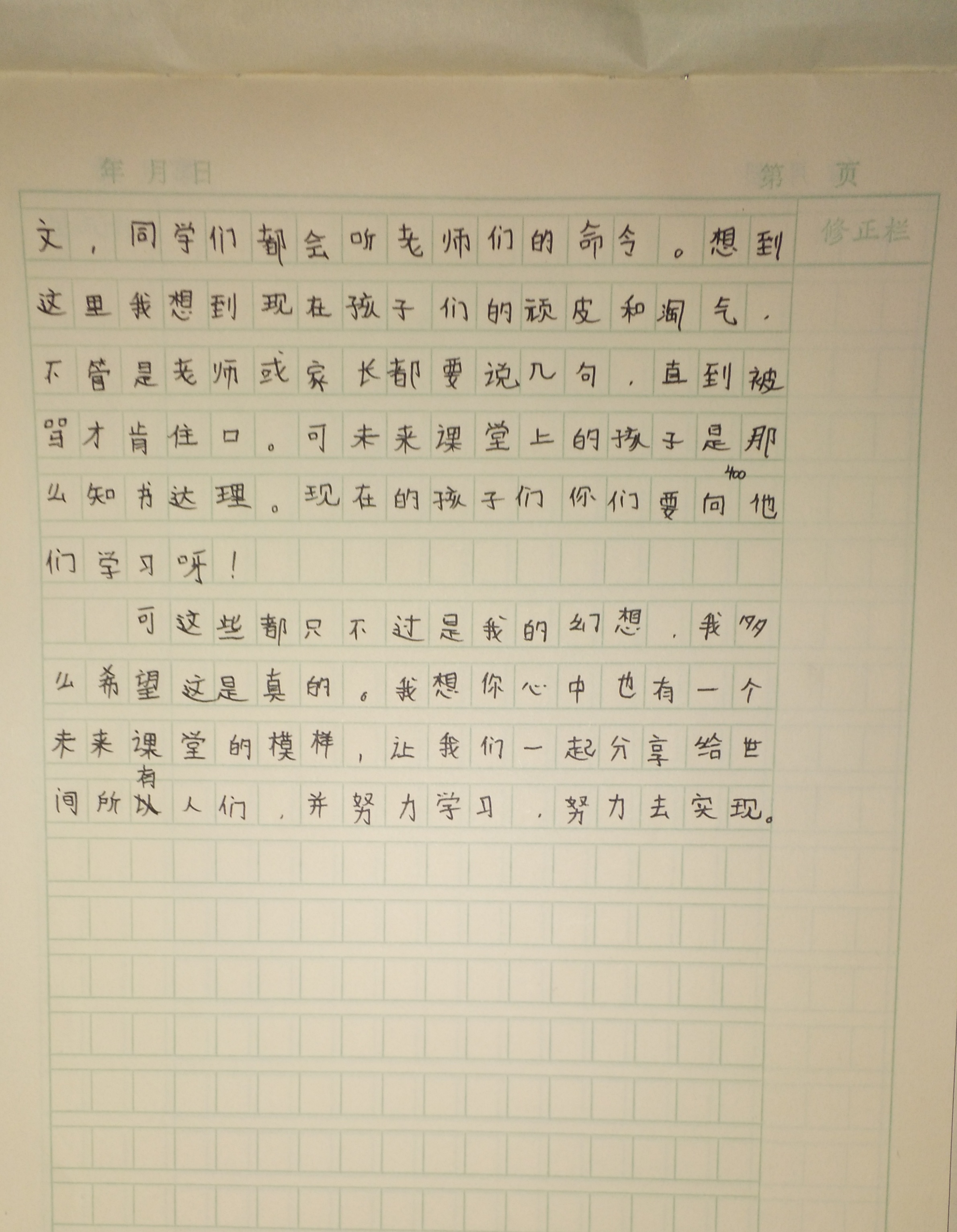 (4) 可这些只不过是我的幻想,我多么希望这是真的。我想你心中也有一个未来课堂的模样,让我们一起分享给世间所有的人们。并努力去学习努力去实现。 眉批:基本符合题目要求。
