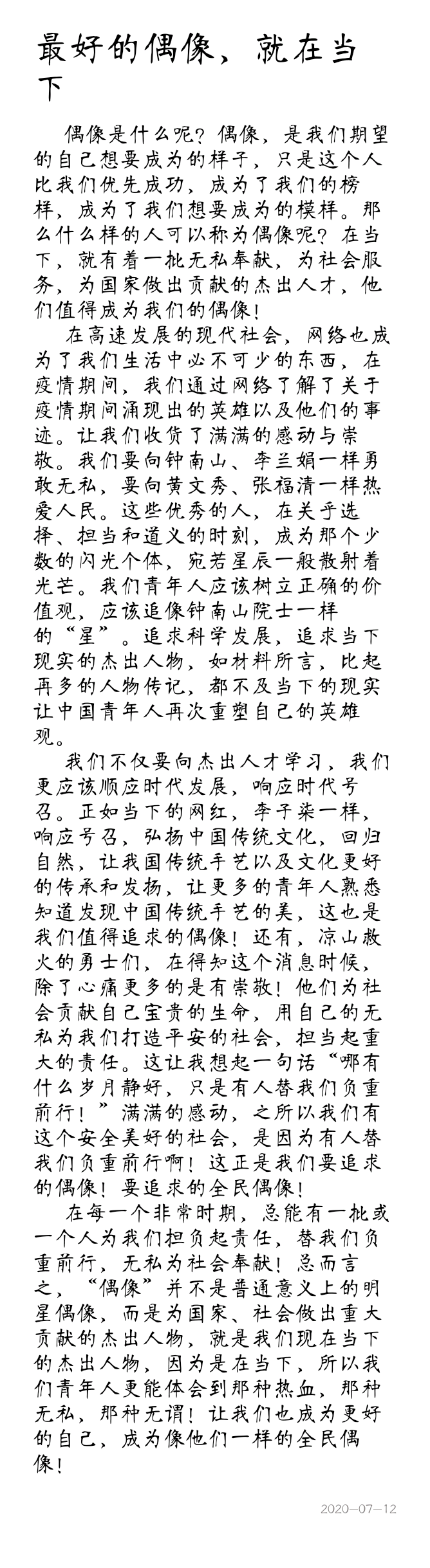 最好的偶像,就在当下 热484 类别:记叙 发表时间:2020-07-19 17:25 已有 485 次阅读 指导老师:白佳 所属学校:巩义市第三高级中学