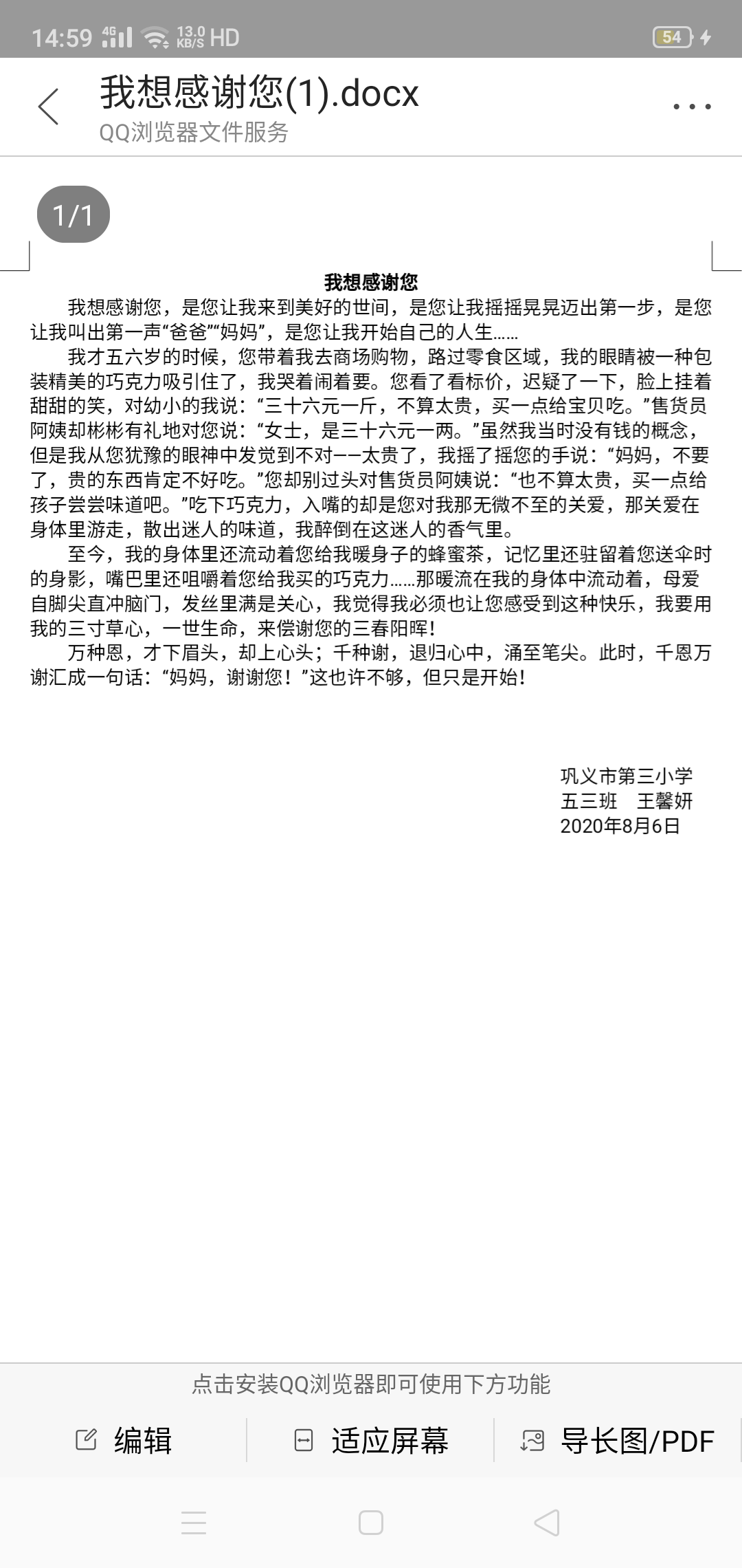 《我想感谢您》 热5138 类别:写人 发表时间:2020-08-07 23:05 已有 5139 次阅读 指导老师:赵东霞 所属学校:巩义市第三小学