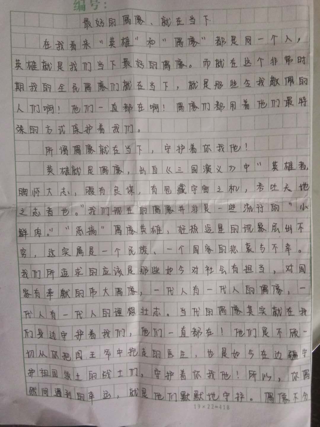 最好的偶像,就在当下 热260 类别:写人 发表时间:2020-07-29 09:25 已有 261 次阅读 指导老师:毛瑞 所属学校:中牟县第三高级中学
