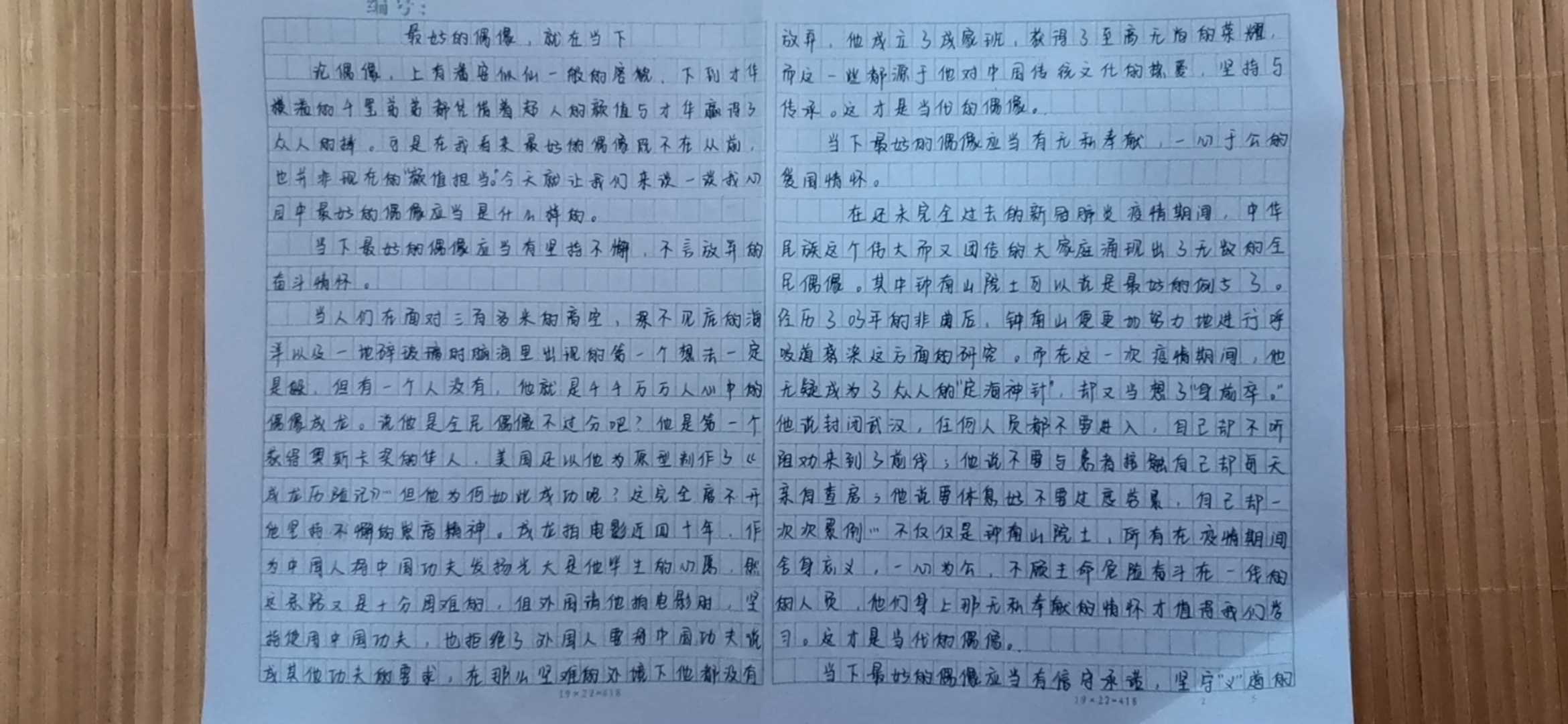 最好的偶像,就在当下 热302 类别:原创 发表时间:2020-07-29 11:39 已有 303 次阅读 指导老师:王建乐 所属学校:中牟县第三高级中学