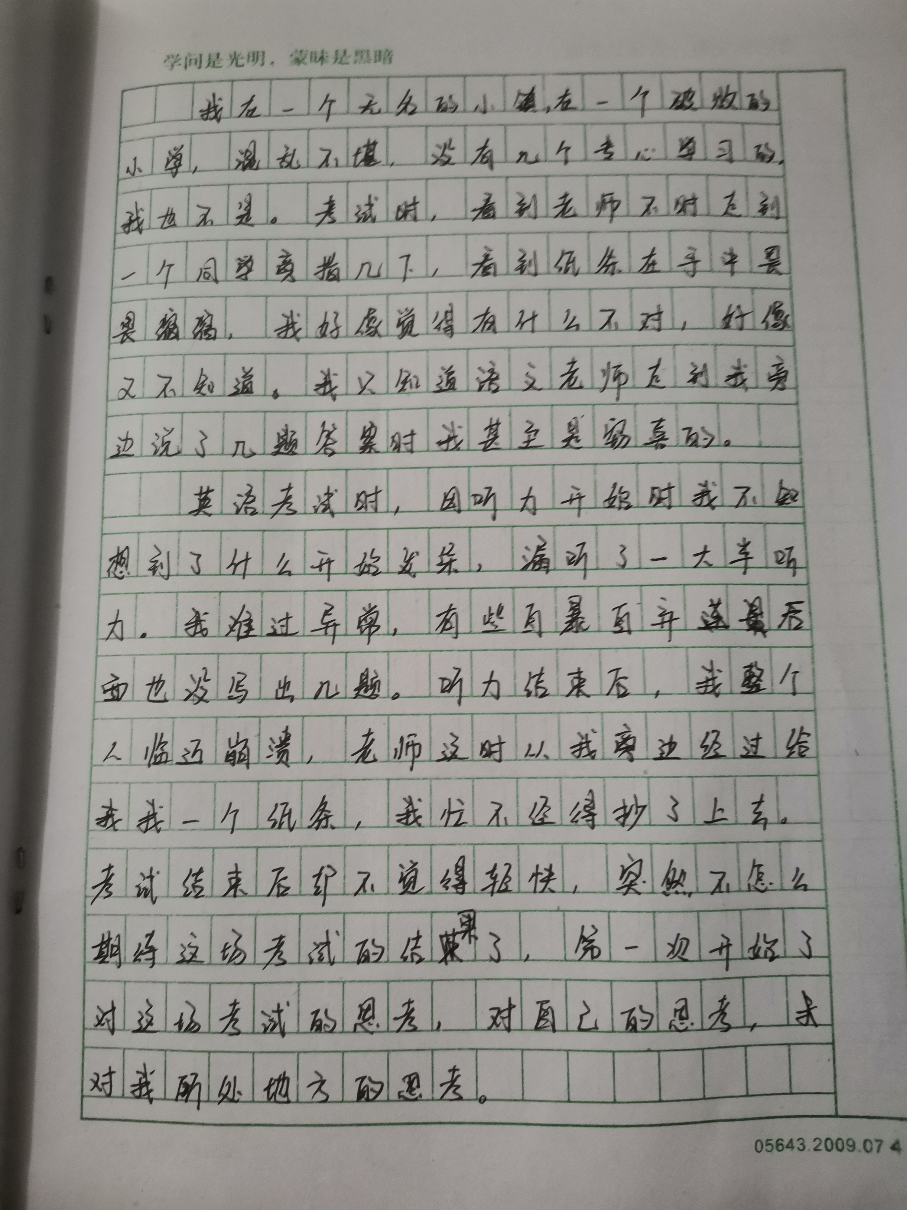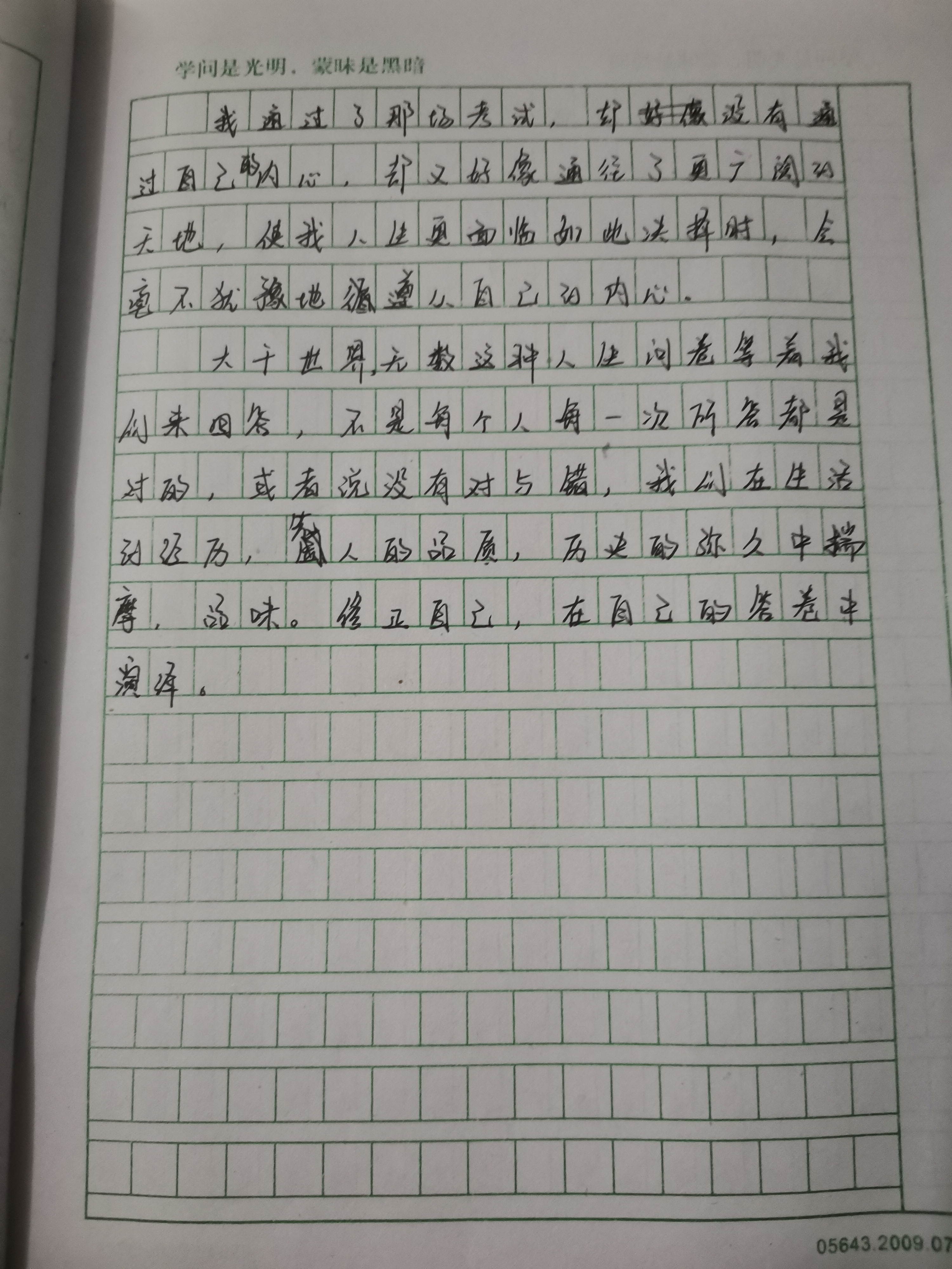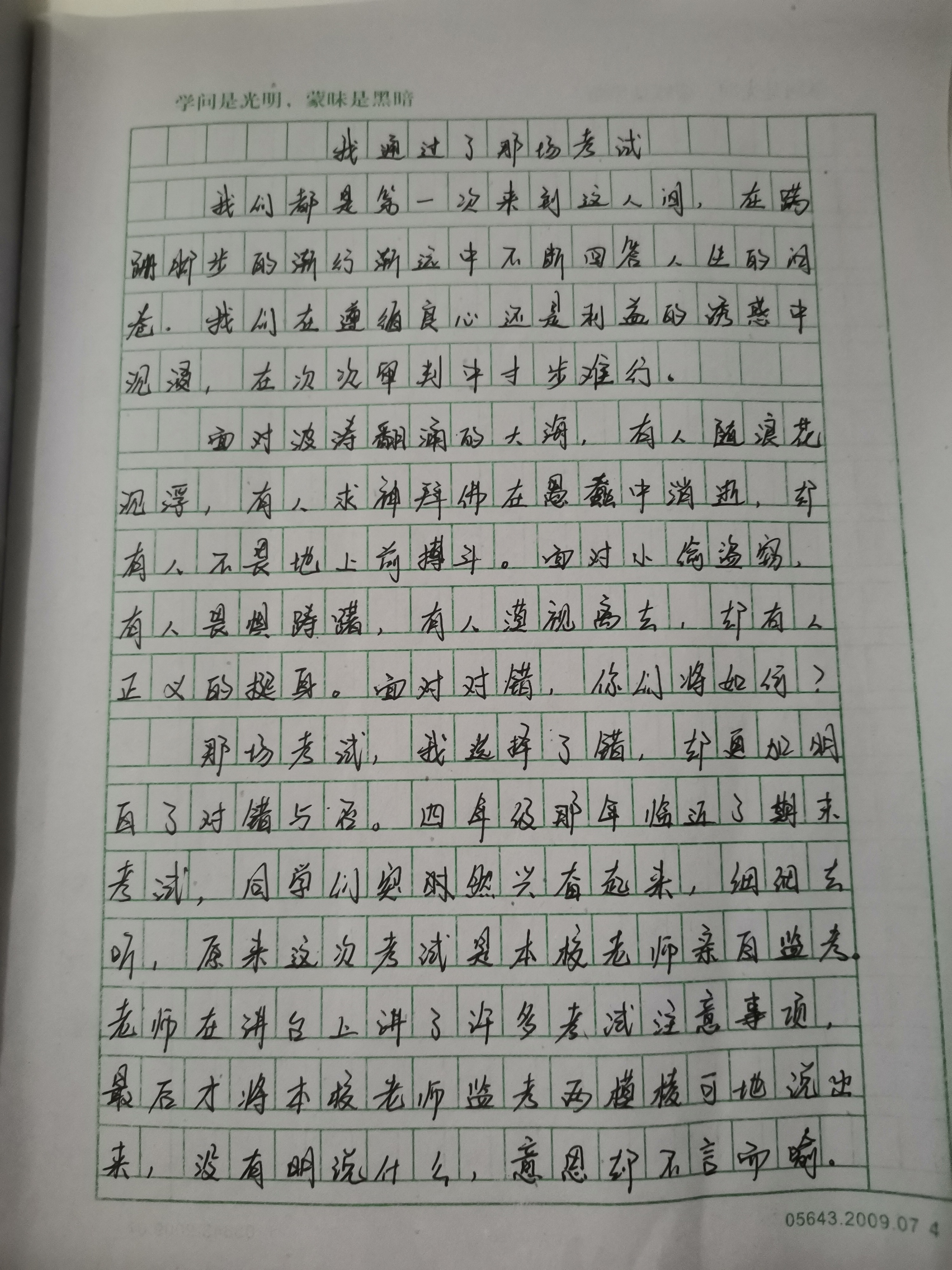 我通过了那场考试 热300 类别:记叙 发表时间:2021-09-14 08:59 已有 301 次阅读 指导老师:谢伟维 所属学校:中牟县紫薇路中学