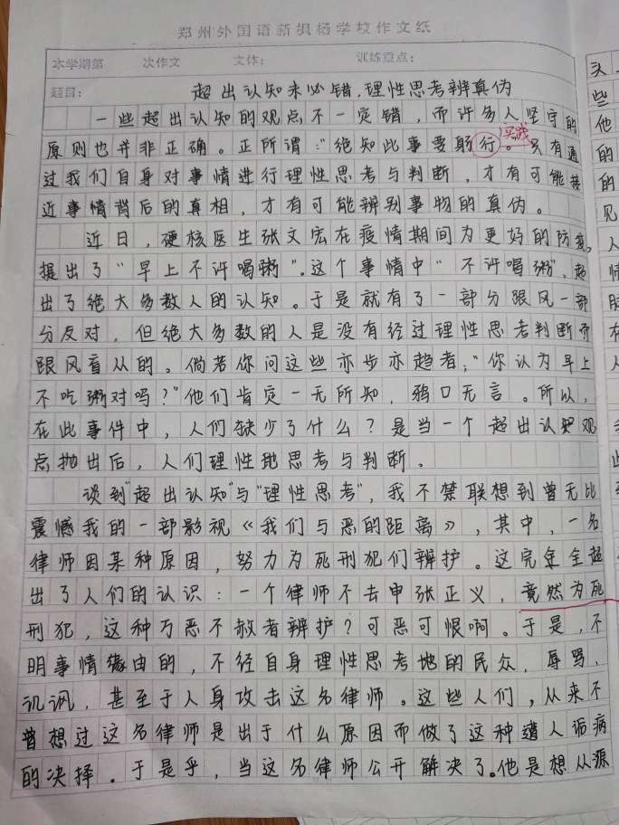 超出认知未必错,理性思考辨真伪 热848 类别:议论 发表时间:2020-08-22 00:44 已有 849 次阅读 指导老师:游艺 所属学校:高新技术产业开发区郑州外国语新枫杨学校