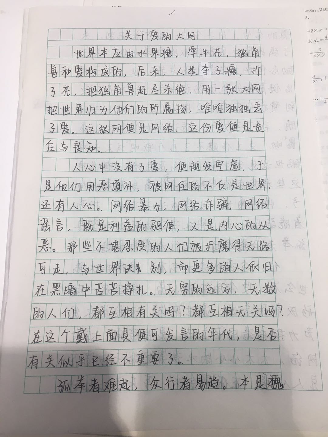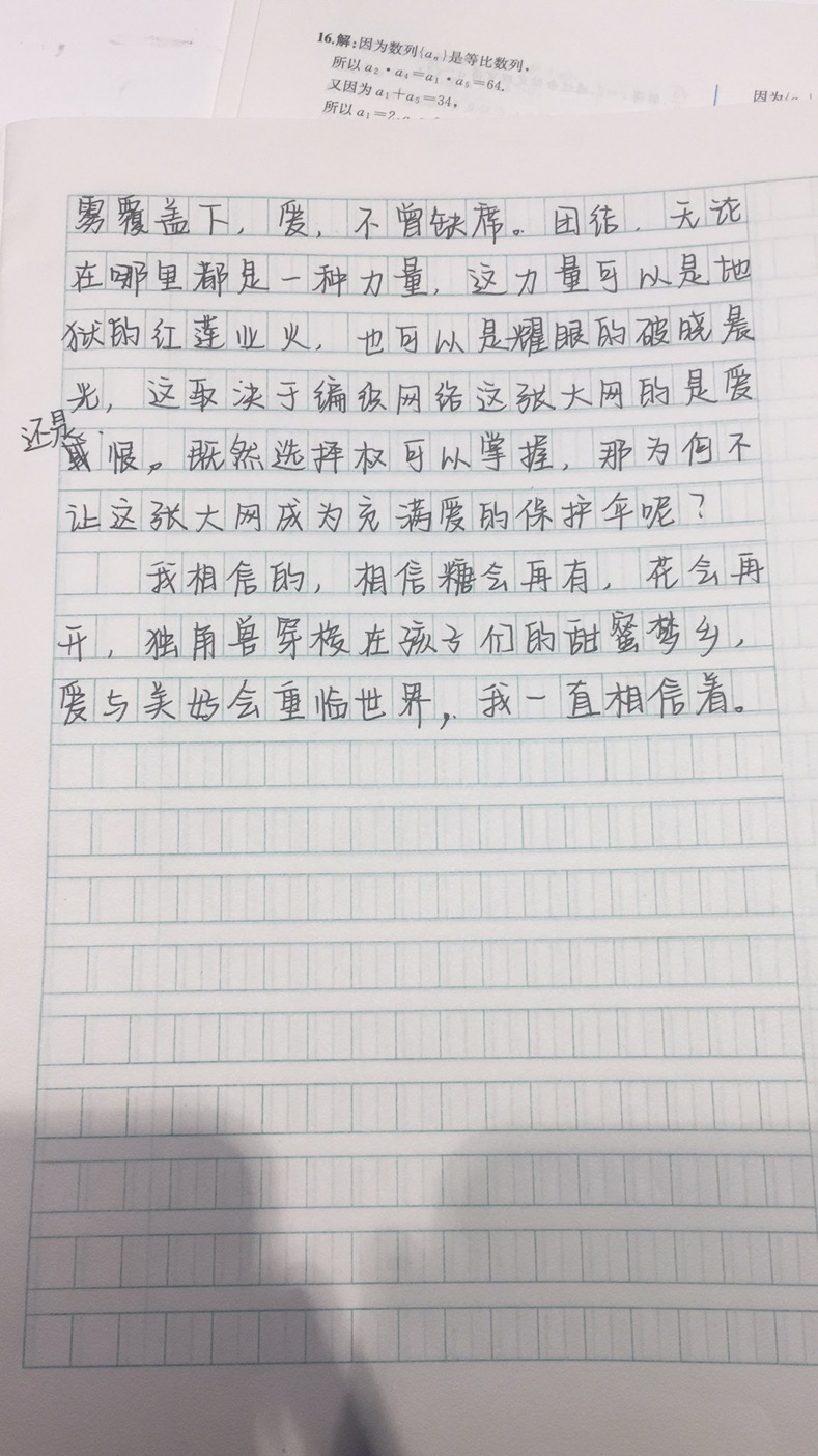 一张关于爱的大网 热268 类别:原创 发表时间:2020-08-30 23:12 已有 269 次阅读 指导老师:孟伟真 所属学校:郑州市二七区第74中学
