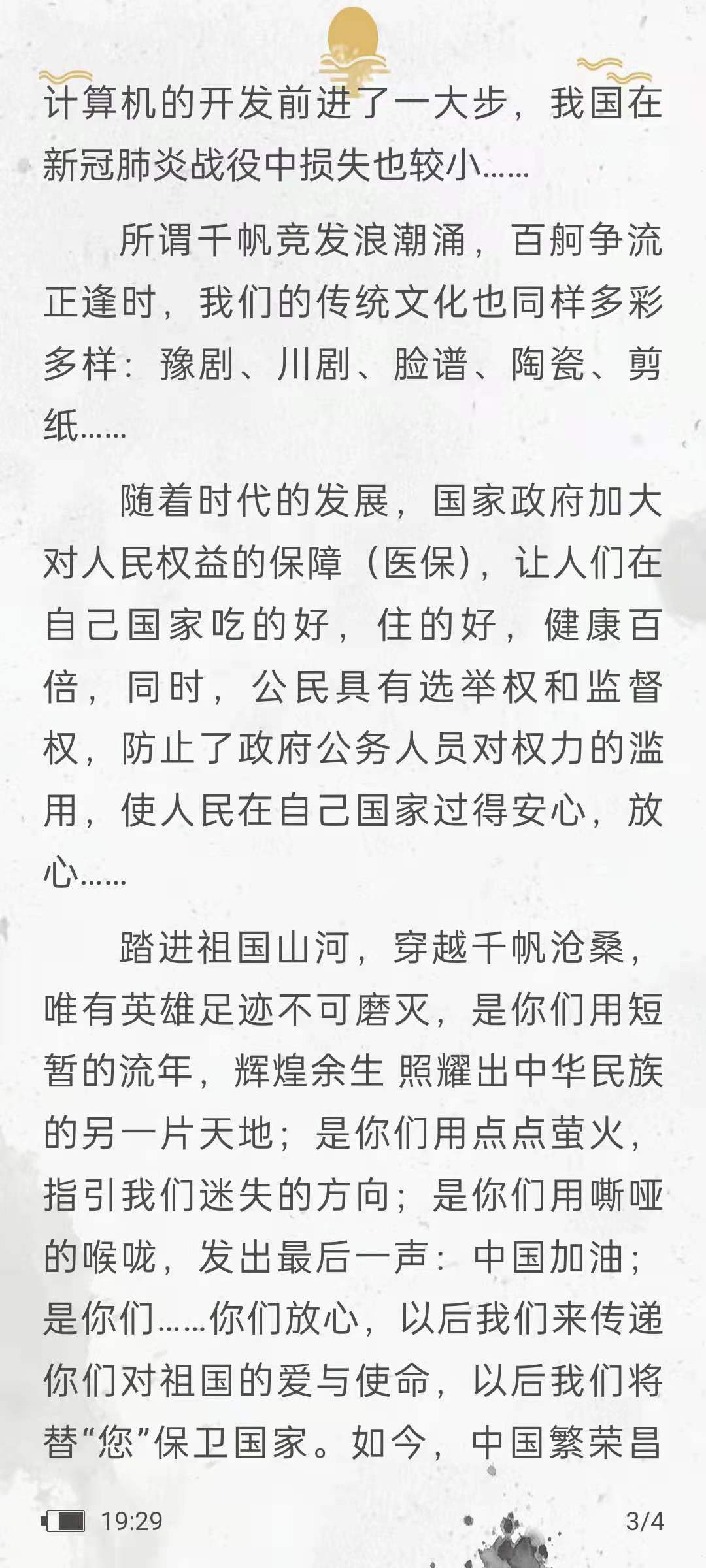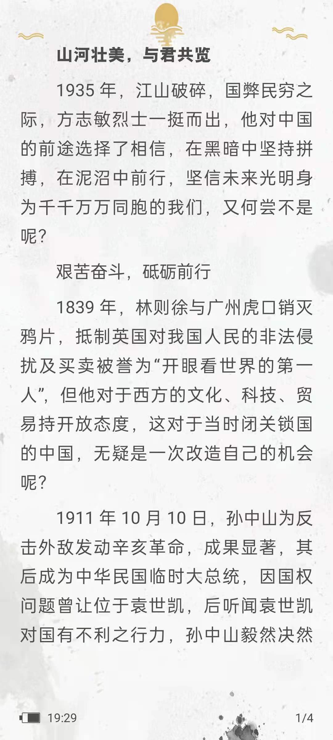 山河壮美,与君共览 热619 类别:议论 发表时间:2021-08-20 19:36 已有 620 次阅读 指导老师:张星星 所属学校:郑州市二七区第74中学