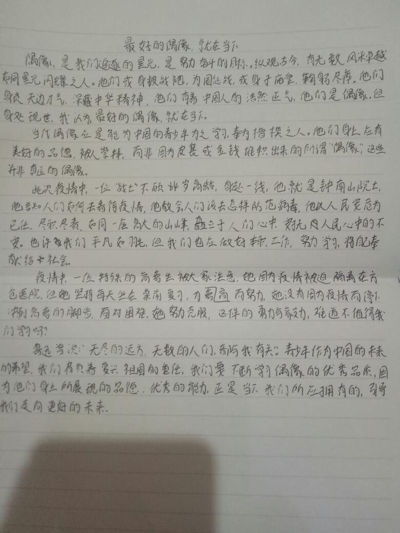 最好的偶像,就在当下 热770 类别:议论 发表时间:2020-10-06 14:44 已有 771 次阅读 指导老师:魏迎锋 所属学校:郑州市第九中学