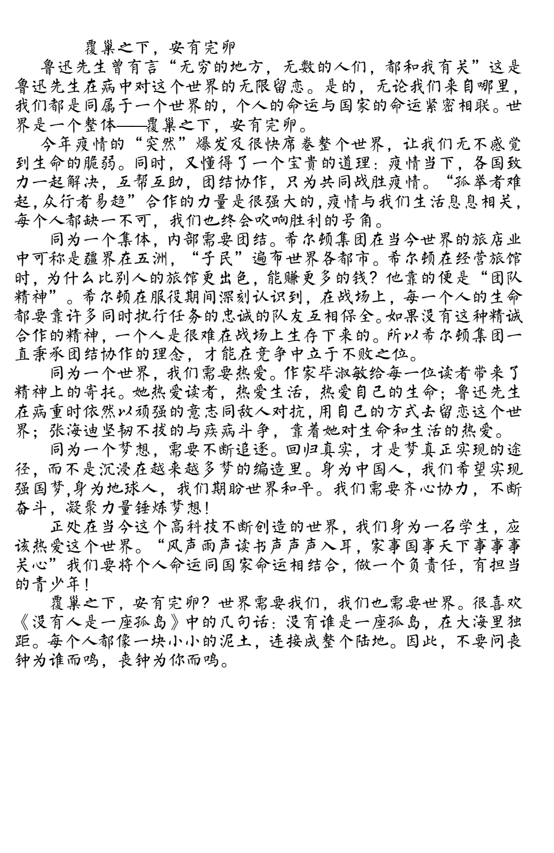 覆巢之下,安有完卵 热640 类别:议论 发表时间:2020-10-06 11:08 已有 641 次阅读 指导老师:贺芳 所属学校:黄河科技学院附属中学