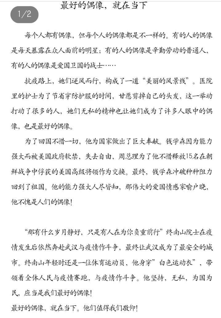 最好的偶像,就在当下 热752 类别:议论 发表时间:2020-10-08 13:26 已有 753 次阅读 指导老师:孙晓蒙 所属学校:黄河科技学院附属中学